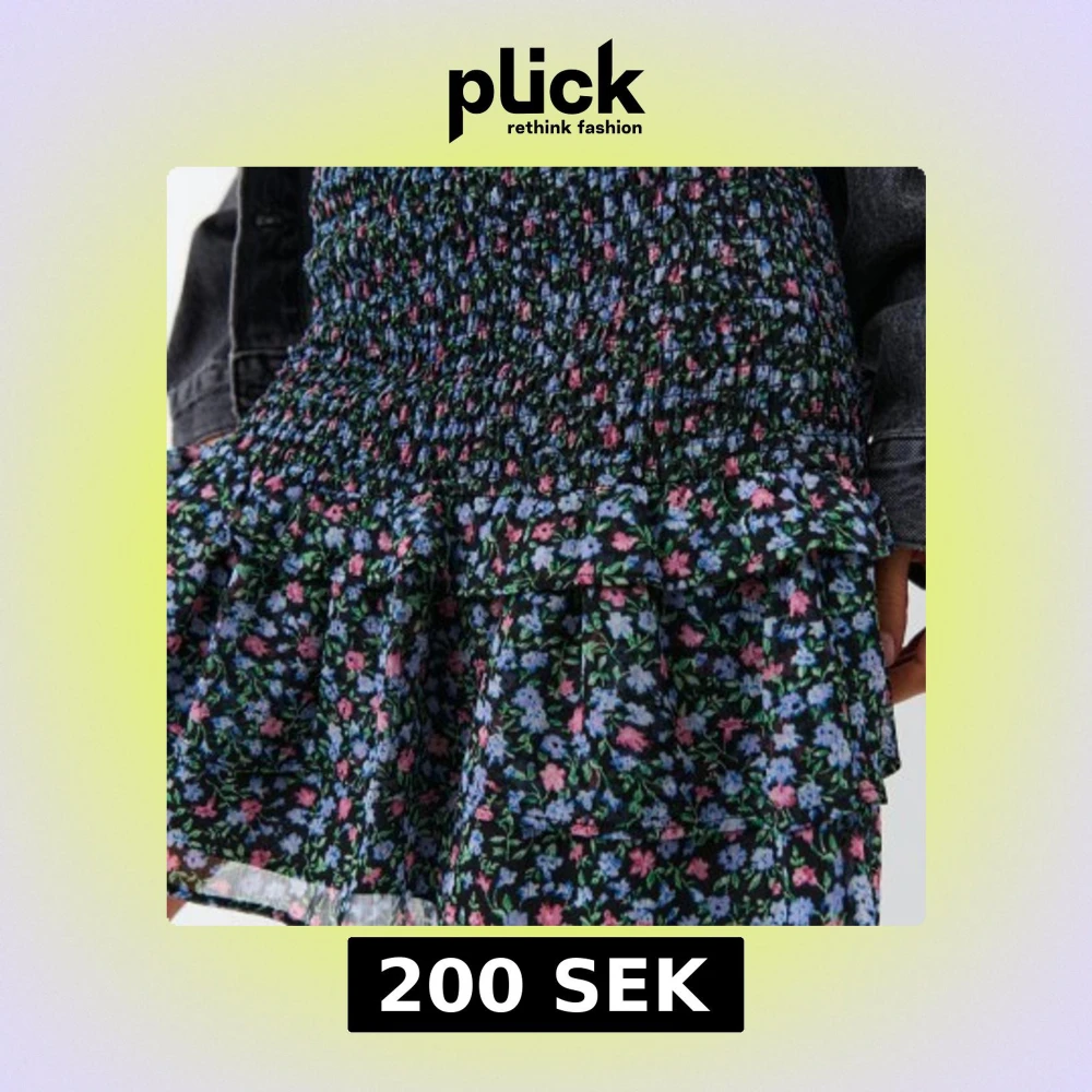 Söt blommig kortkjol med volangdetaljer. Kjolen har en elastisk midja och ett färgglatt mönster i blått, rosa och grönt på en svart bakgrund. Perfekt för en somrig look! Material: 97% polyester,3% Elastan. Tvättråd: skontvätt 40C. Original pris 359.95 SEK. Men jag säljer för 200 Kr. Pris går att diskutera