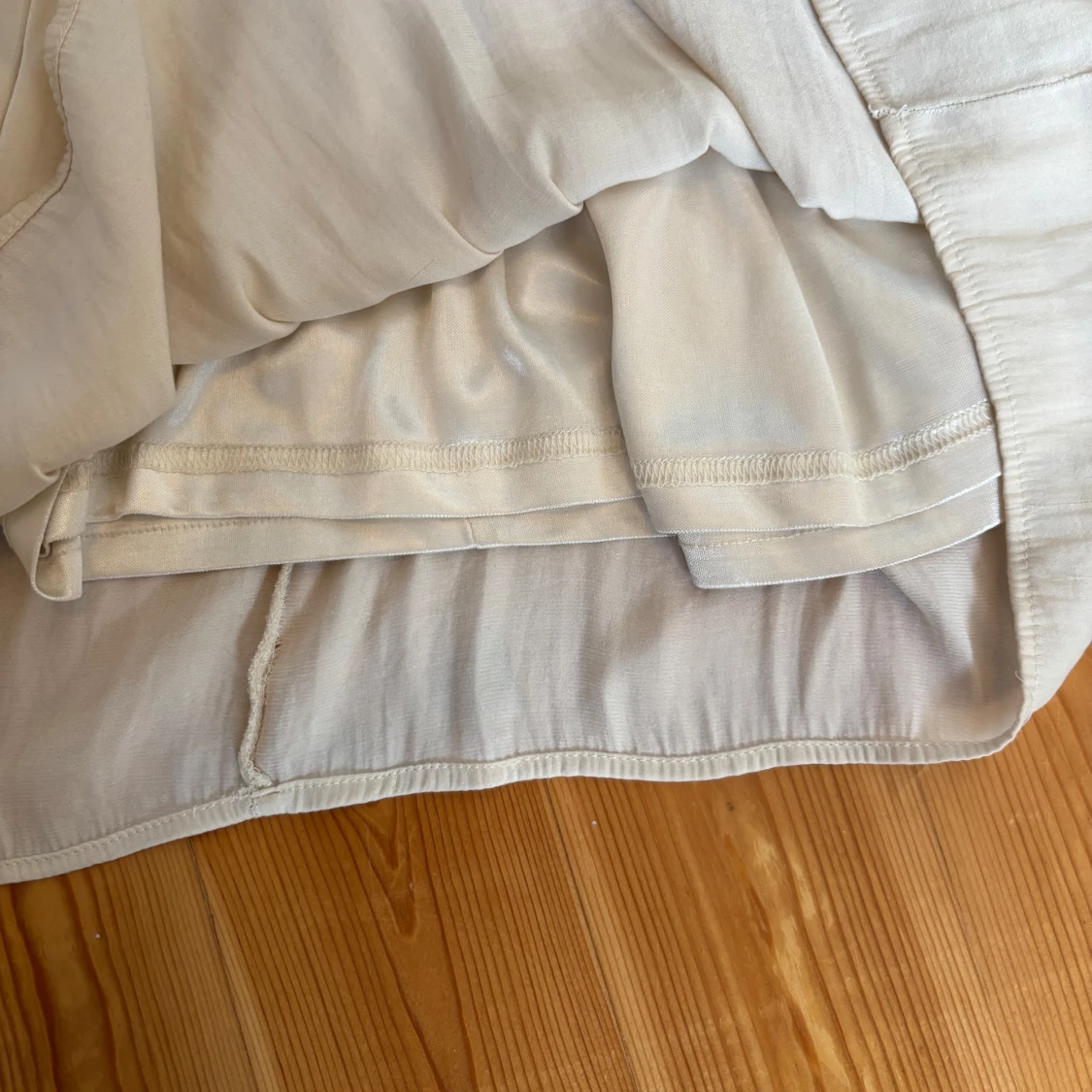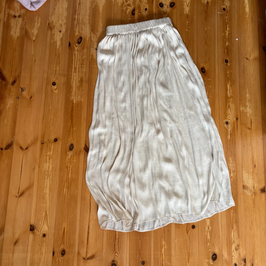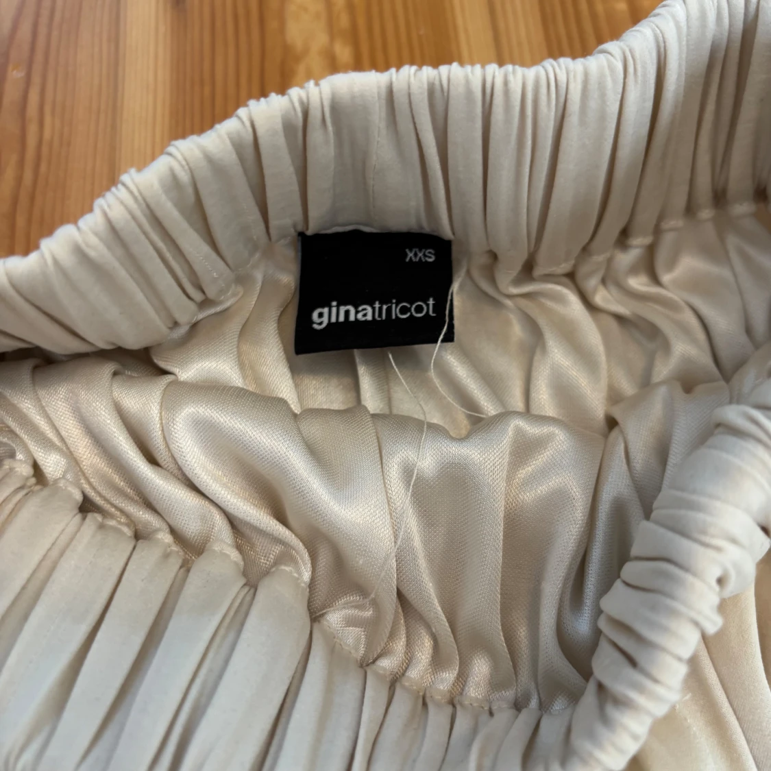 Supersnygg krämvit långkjol från Gina tricot. Kjolen har resår i midjan. Storlek XS. Varan har lite täcken på användning. Längs ner är sömarna lite slitna och tyget har lite strådar som sticker upp (se bild 4 och 5). KAN ABSOLUT GÅ NER I PRIS VID SNABB AFFÄR ELLER BUNDLE!