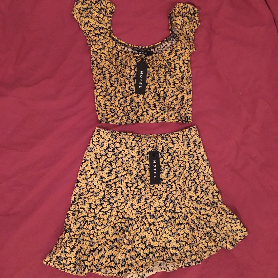 Ett somrigt set från Motel Rocks. Kjolen är i storlek M och toppen i storlek S, båda är oanvända med prislapp kvar. 250kr styck eller båda för 450kr.