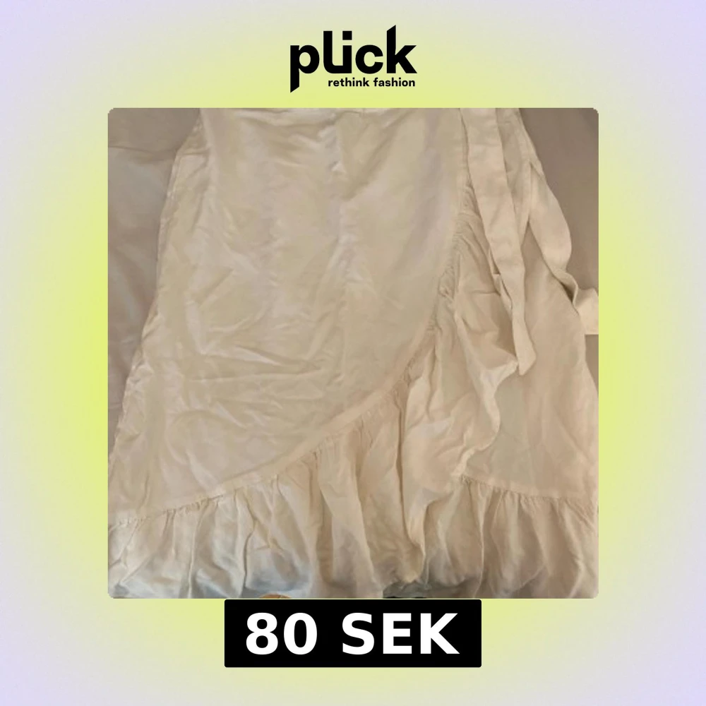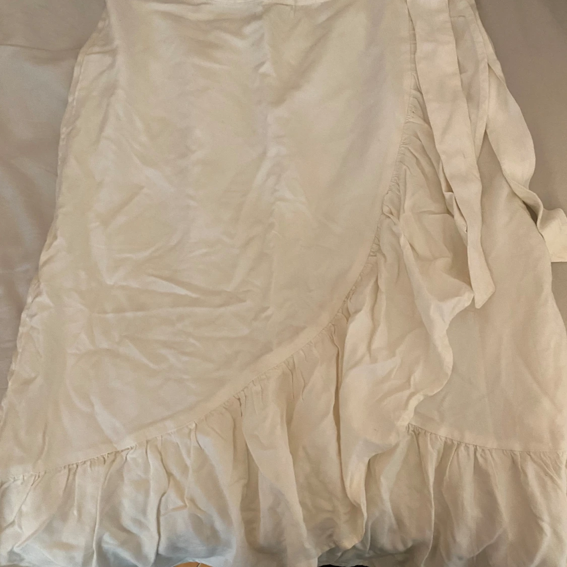 Säljer en vit omlottkjol från Pimkie med volangdetalj längs nederkanten. Kjolen har knytband i midjan och är perfekt för en fräsch och somrig look. Lätt och luftig modell som passar till många olika stilar. Skulle gissa på att storleken är runt xs/s men vet inte helt säkert!