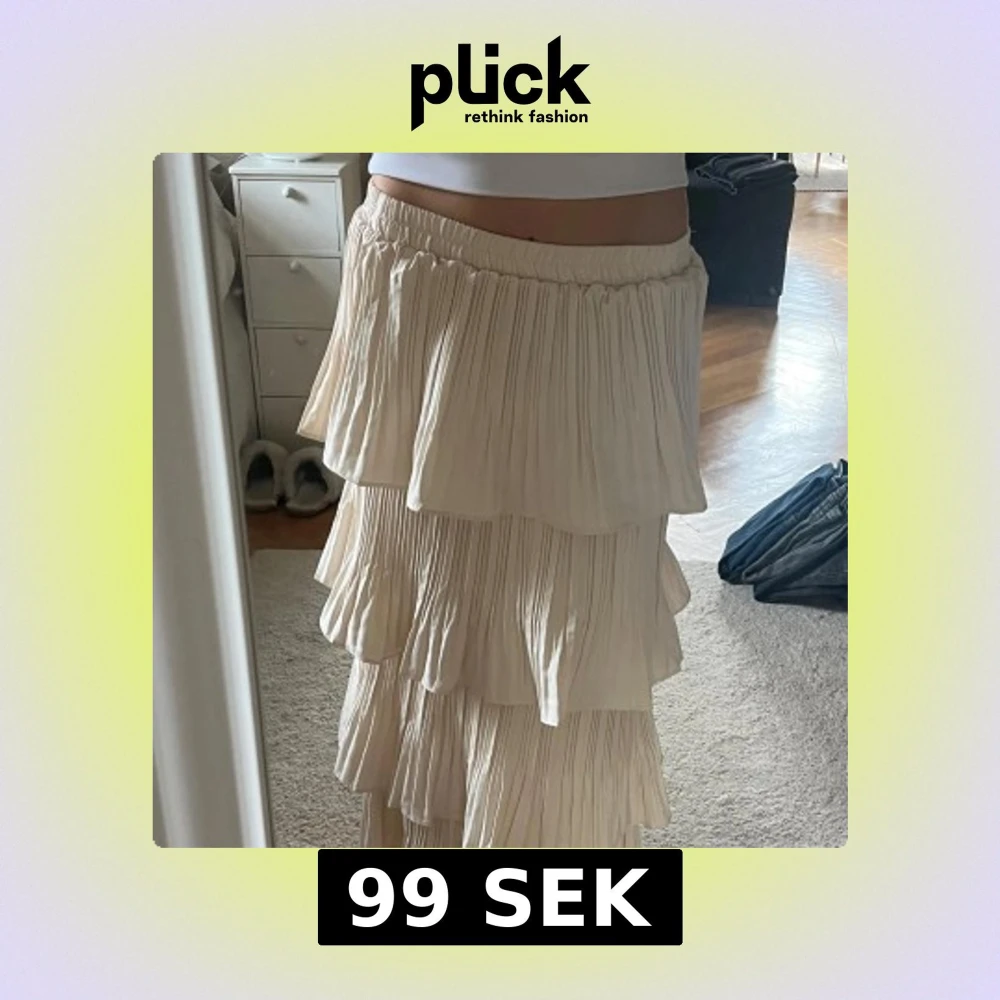 Säljer en supersöt plisserad långkjol i ljusbeige med flera lager volanger. Kjolen har resår i midjan och ett flowigt, romantiskt fall. Materialet känns mjukt och lätt 💌💌💌