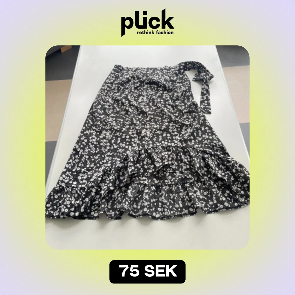 Längre kjol svart med små vita blommor. Kjolen går en bit nedanför knäna. Liten volang nertill som är snedklippt, mycket fin sommarkjol.