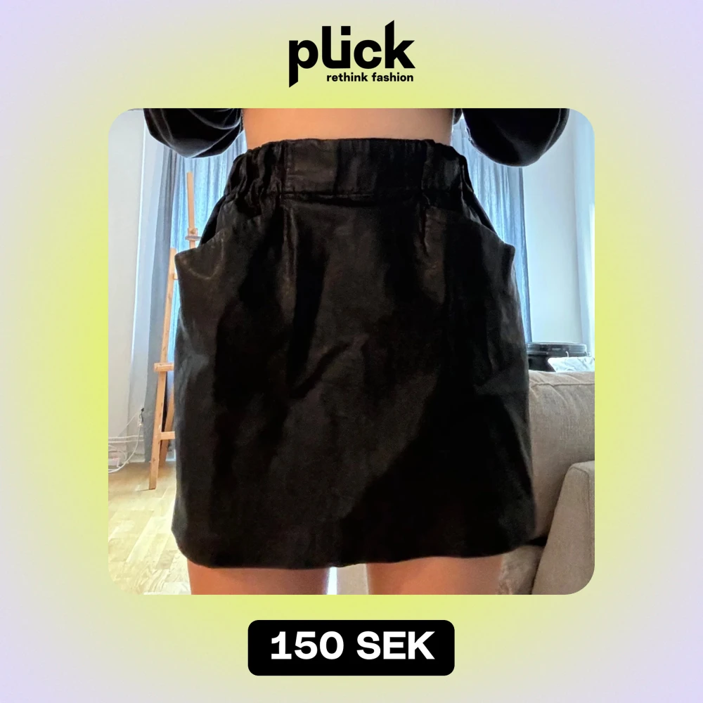 Snygg svart kortkjol i skinnimitation med hög midja och elastisk resår. Perfekt för en kväll ute eller en trendig vardagslook. Den har en enkel design utan extra detaljer, vilket gör den lätt att matcha med olika toppar och accessoarer.
