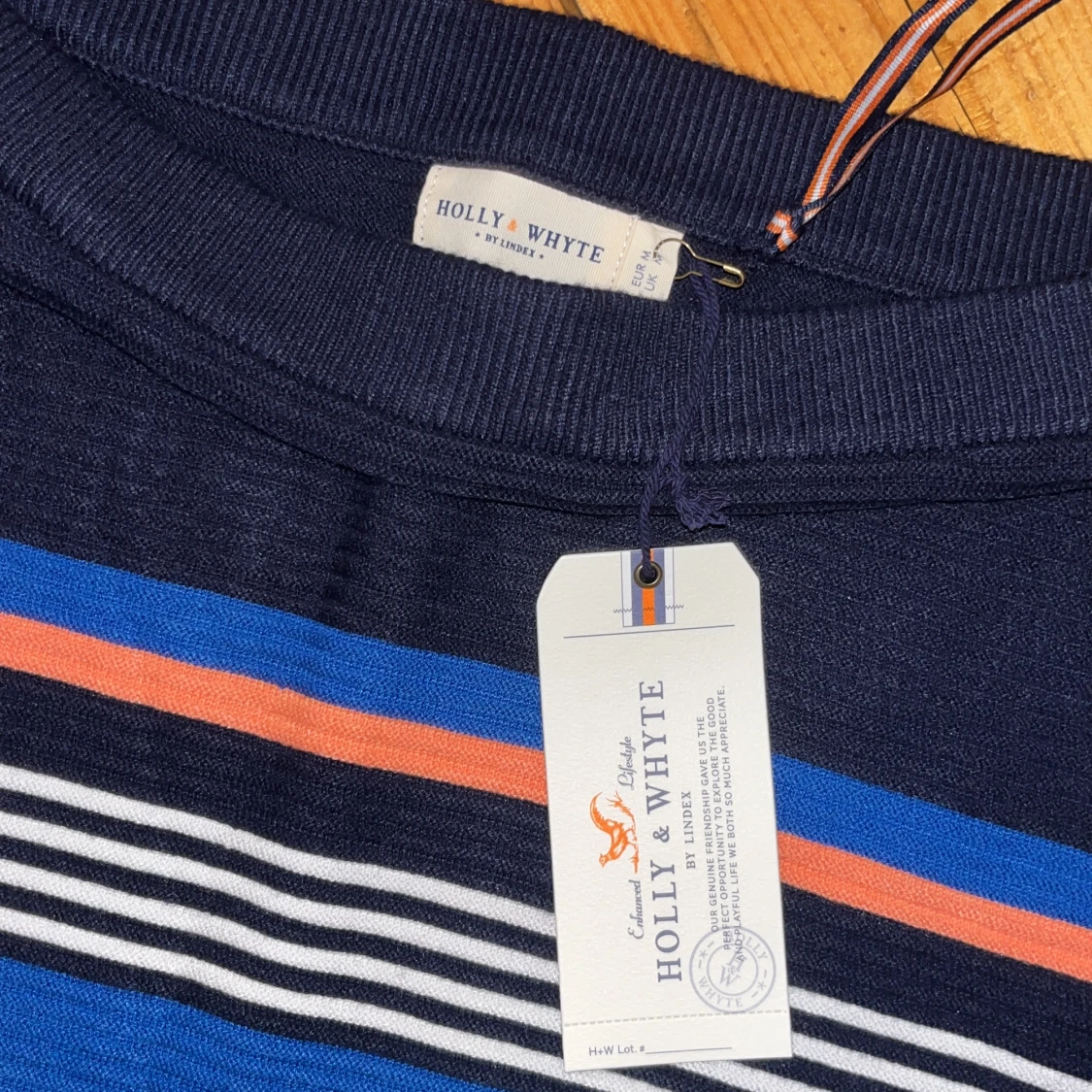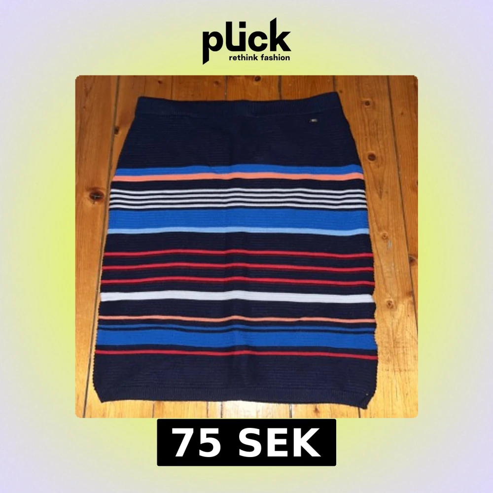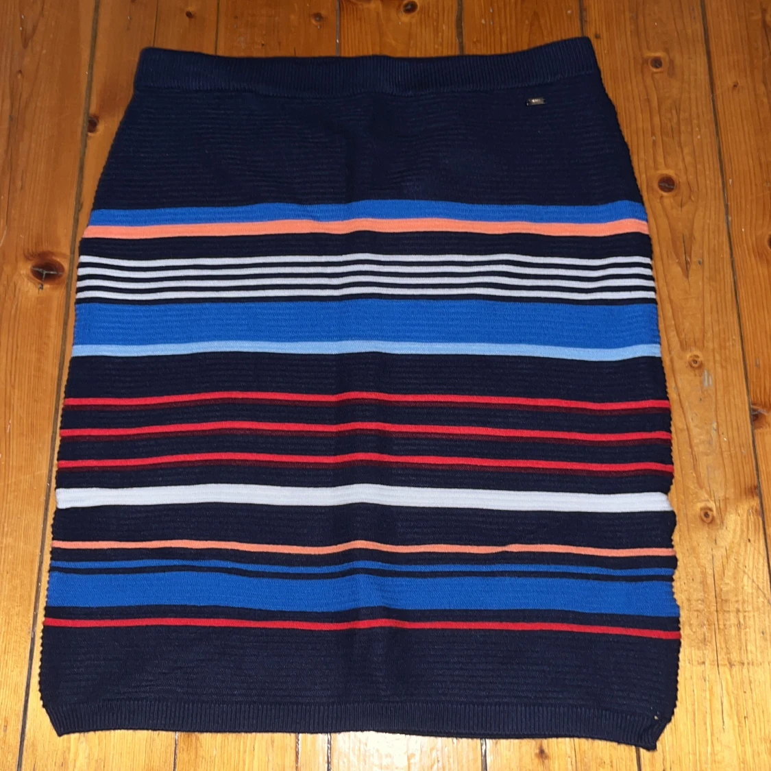 Snygg stickad kjol från Holly & Whyte med horisontella ränder i marinblått, blått, vitt, rött och orange. Kjolen har en elastisk midja och är gjord i mjukt stickat material som sitter bekvämt och har en cool, ungdomlig vibe.