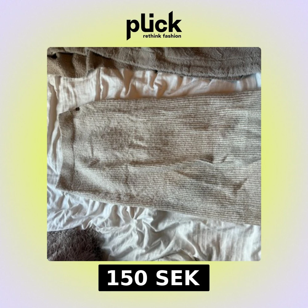 Supermysig långkjol från Pernilla Wahlgren i storlek XS. Kjolen är stickad i beige och grå toner med ett diskret randigt mönster. Den har en bred, ribbad midja och en liten dekorativ knapp i guld vid linningen. Perfekt för dig som gillar chill och stilren look.