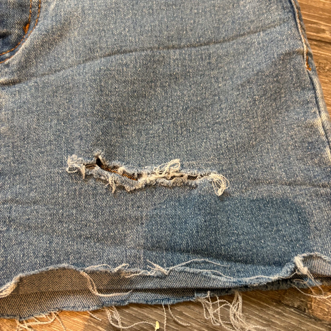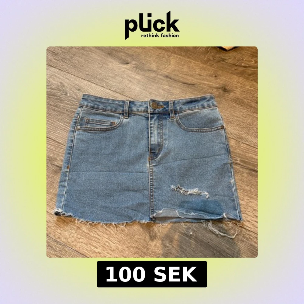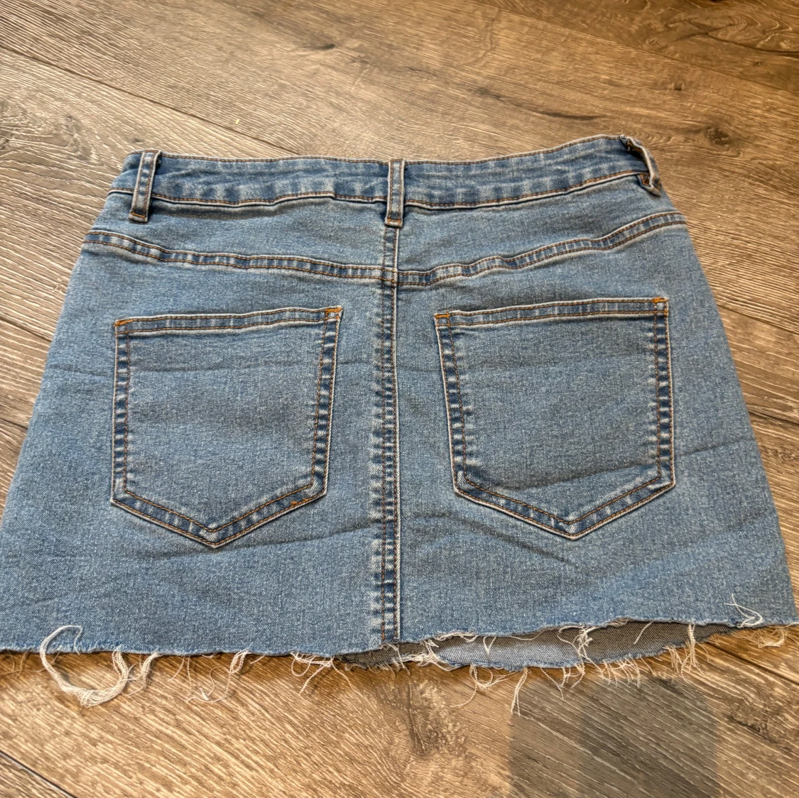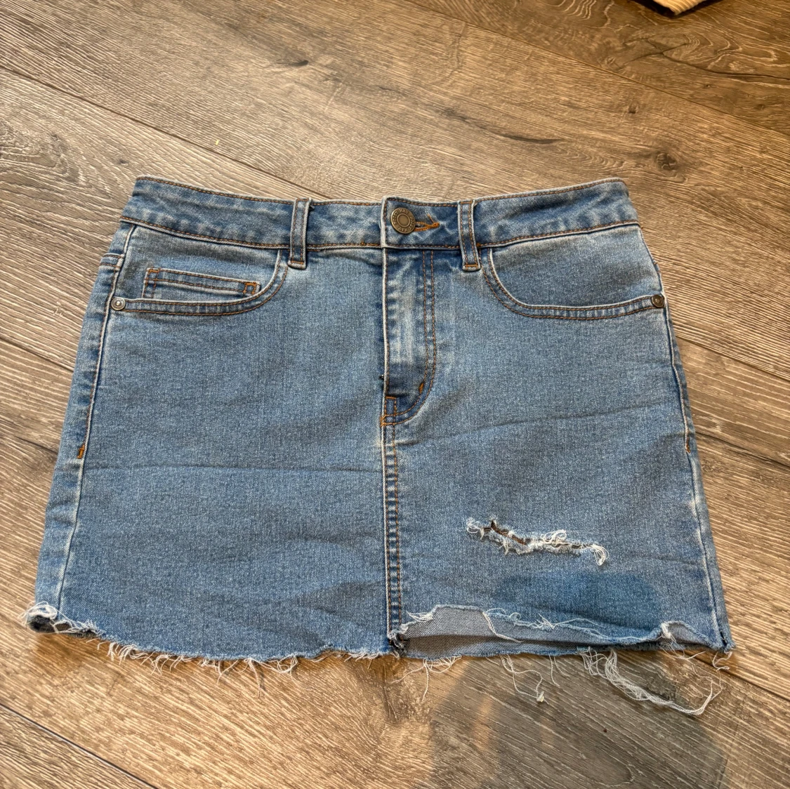Säljer en blå jeanskjol med rå kant och slitningar framtill för en cool och avslappnad vibe. Kjolen har klassiska fickor både fram och bak samt hällor för bälte. Perfekt för dig som gillar streetstyle och denim.