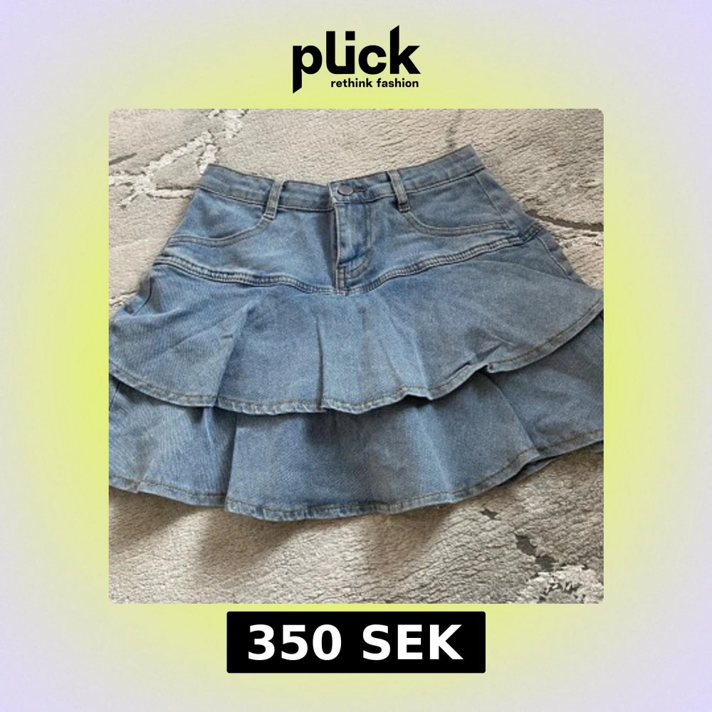 Supersöt blå jeanskjol med två lager volanger och klassiska fickor fram. Den har endast använts 1 gång och har även inbyggda short!