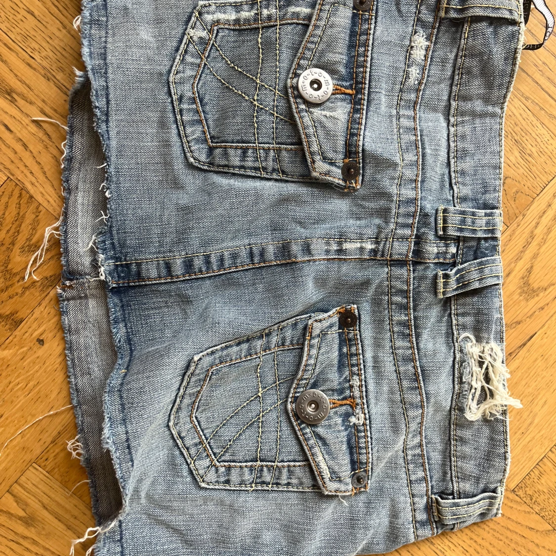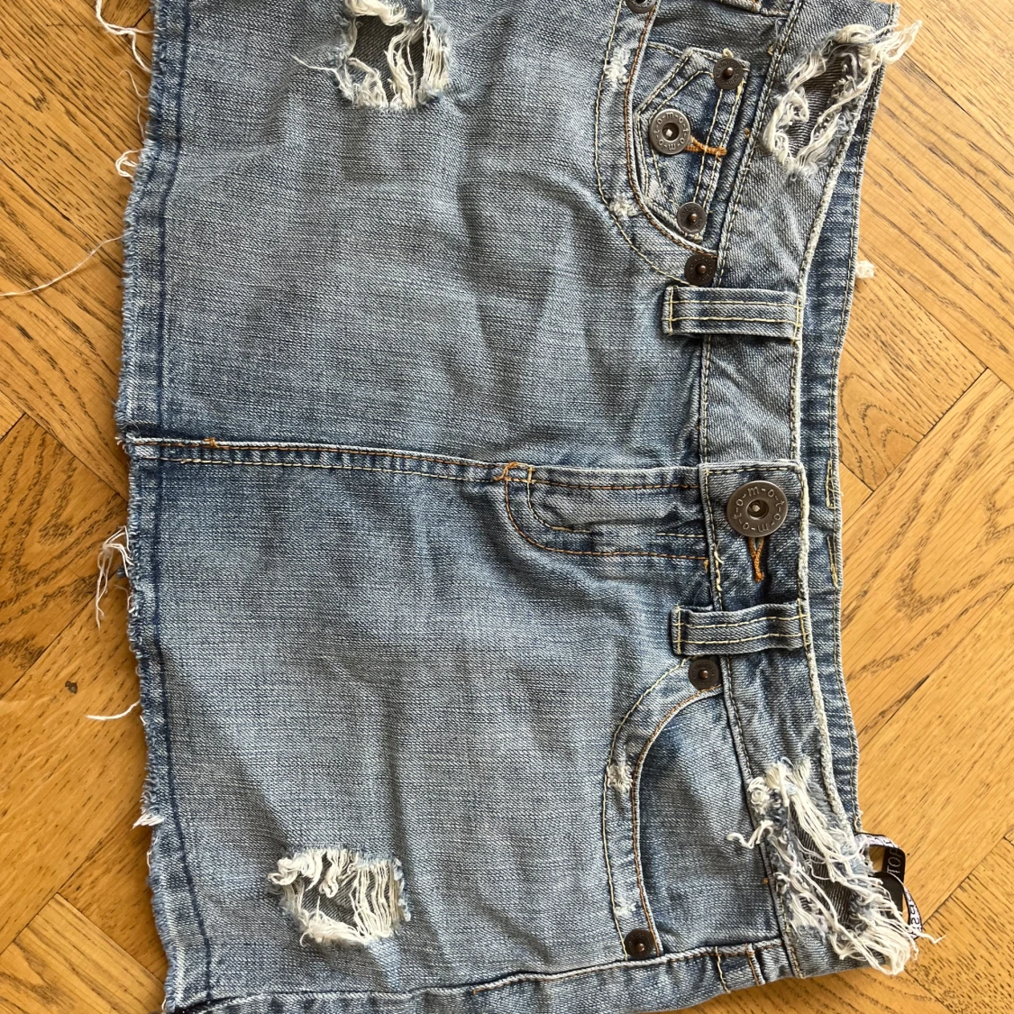 Snygg ljusblå jeanskjol från Top shop med slitna detaljer och råa kanter. Kjolen har flera fickor med knappar både fram och bak samt coola bälteshällor.