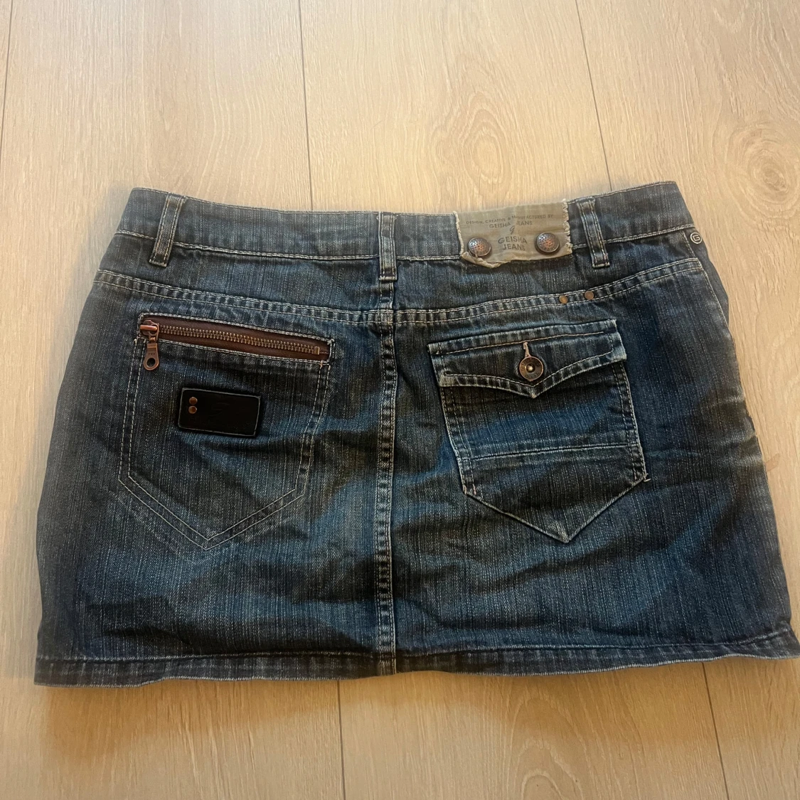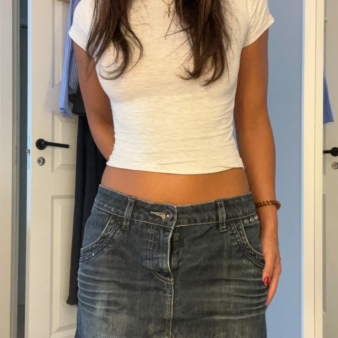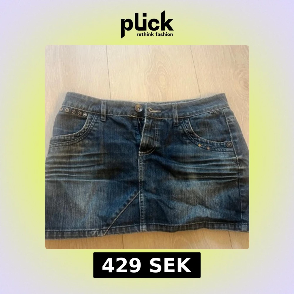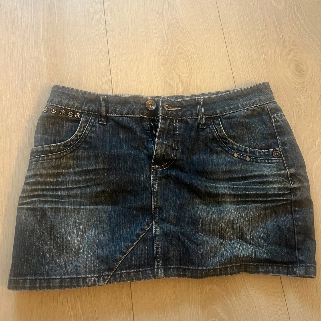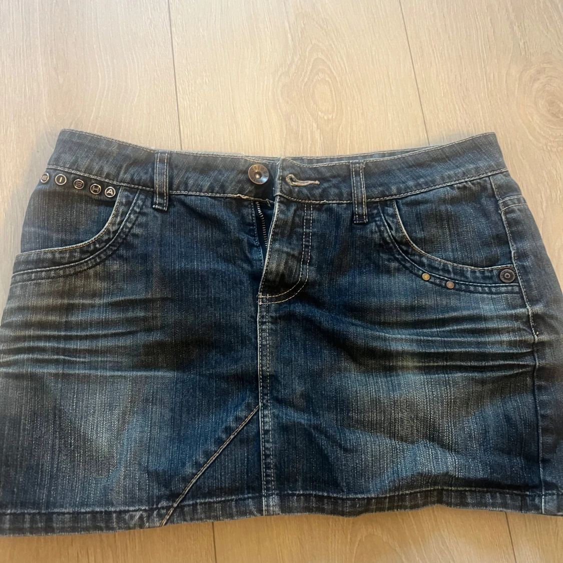 Snygg mörkblå lågmidjad jeanskjol med coola nitar vid fickorna. Storlek S/M