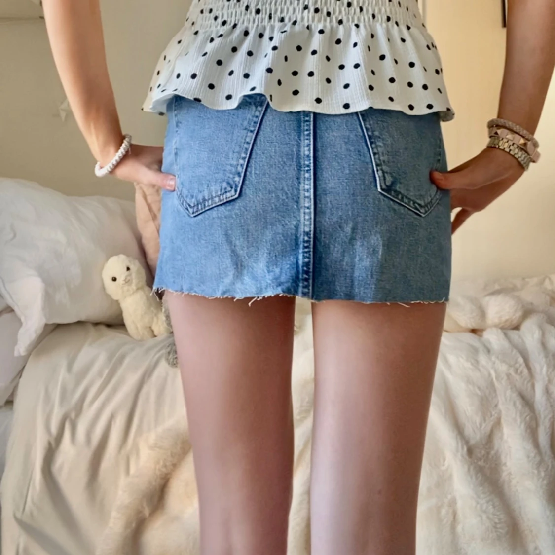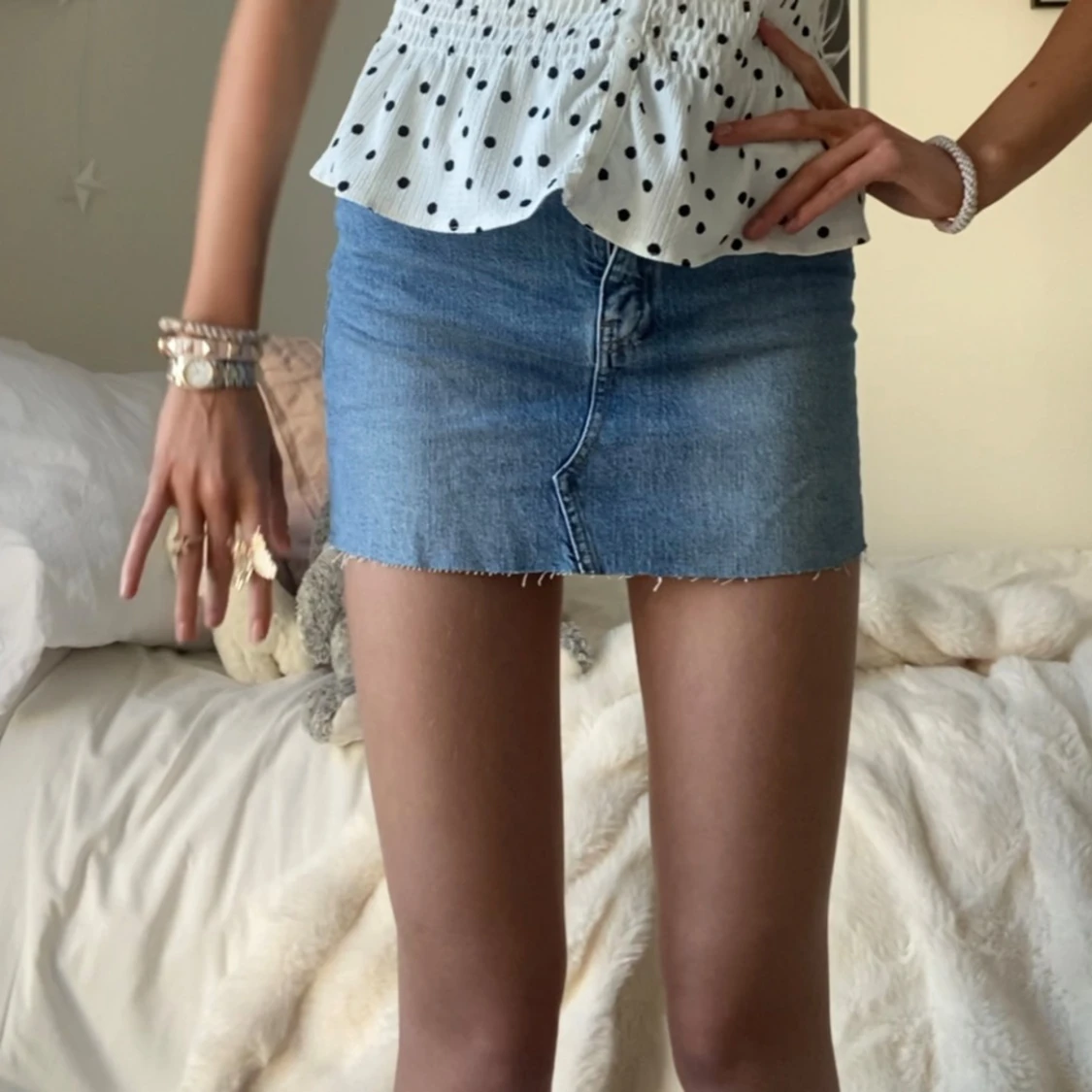 Snygg ljusblå jeanskjol i kort modell med rå, fransig kant nertill. Kjolen har klassiska bakfickor och enkel design utan extra detaljer. Perfekt för dig som gillar en clean och avslappnad stil. Den är högmidjad och sitter tajt.