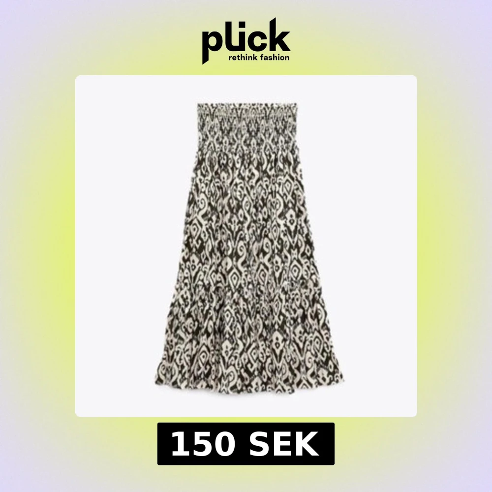 Supersnygg långkjol i svart och vitt med ett unikt grafiskt mönster. Kjolen har smock i midjan för en bekväm passform och faller snyggt i flera volanger. Perfekt för dig som vill sticka ut med en cool och trendig look. I mycket bra skick