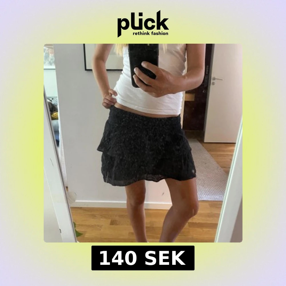 (Igga den smutsiga spegeln) Supersöt svart kortkjol från Gina Tricot med bred smock i midjan och dubbla volanger. Kjolen är lätt och luftig, perfekt för varma dagar.