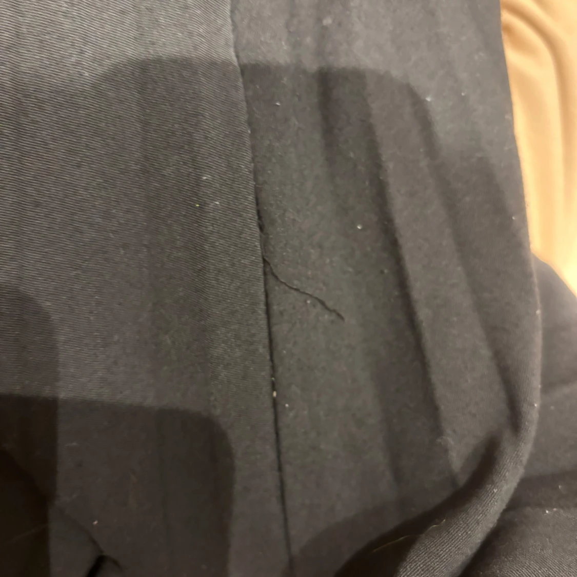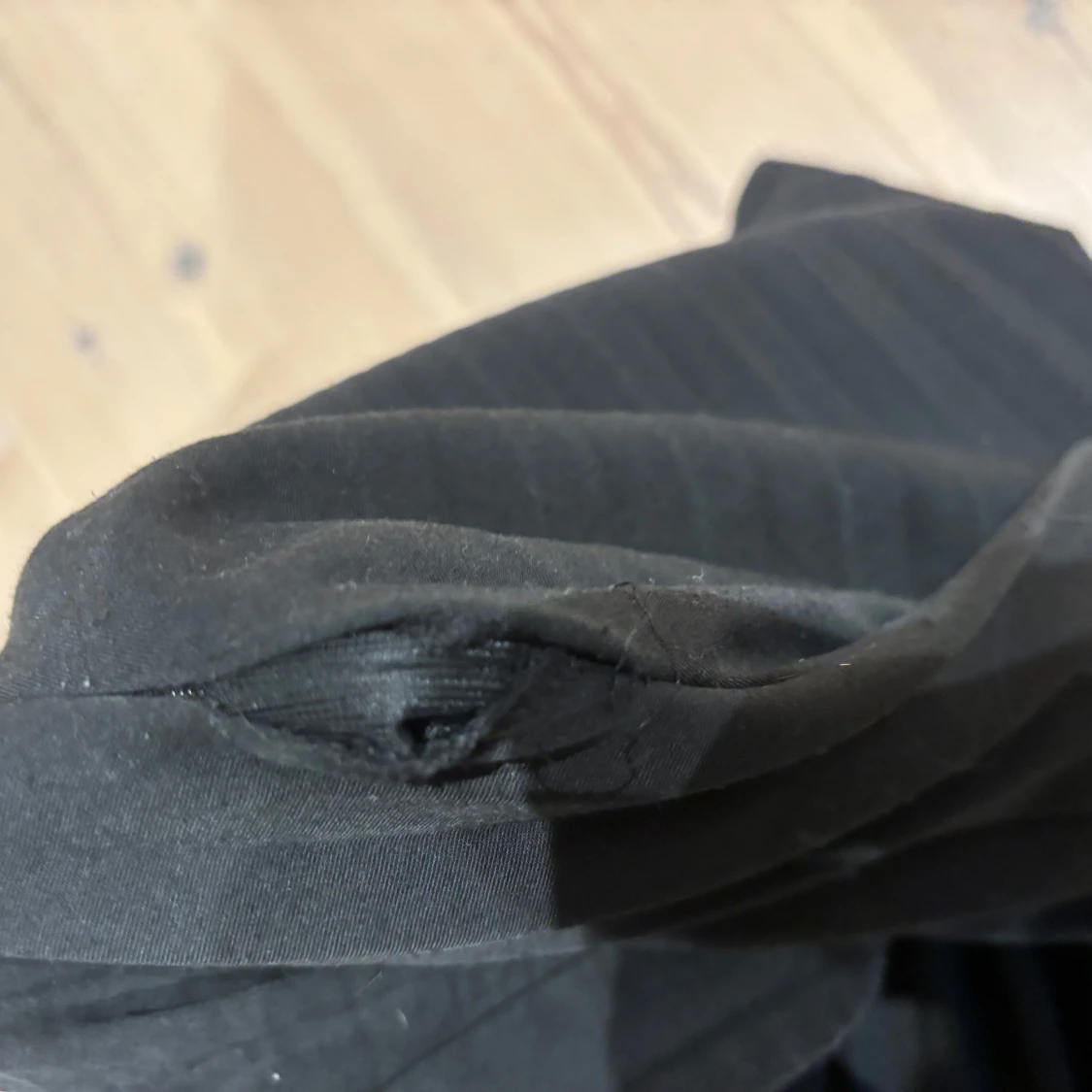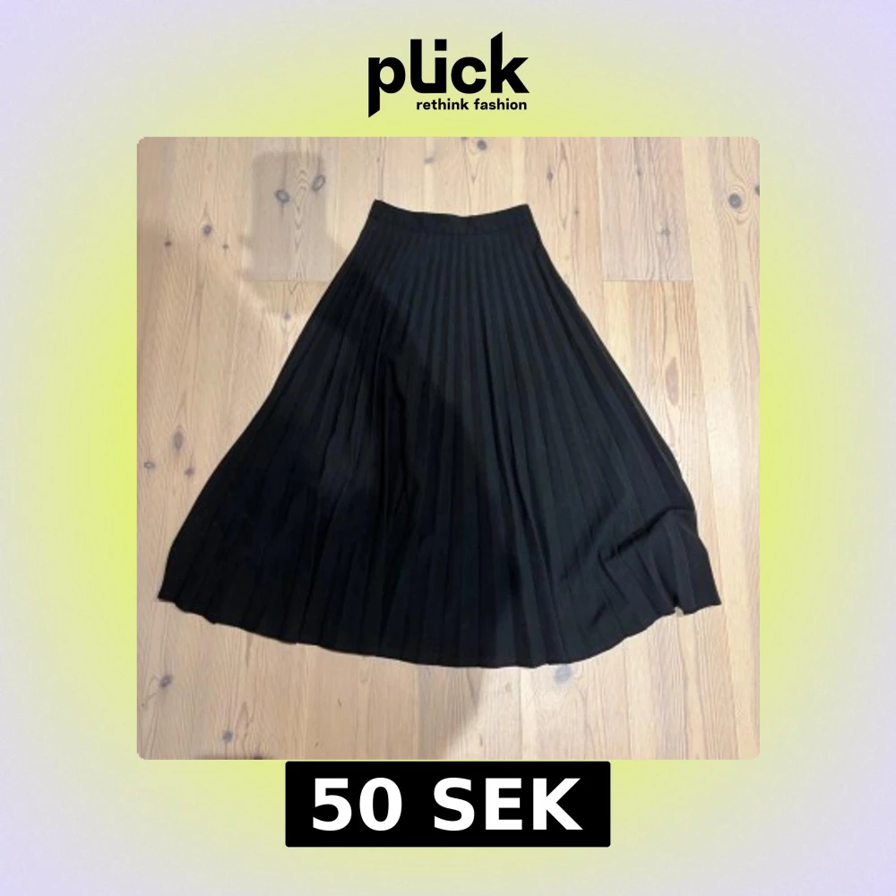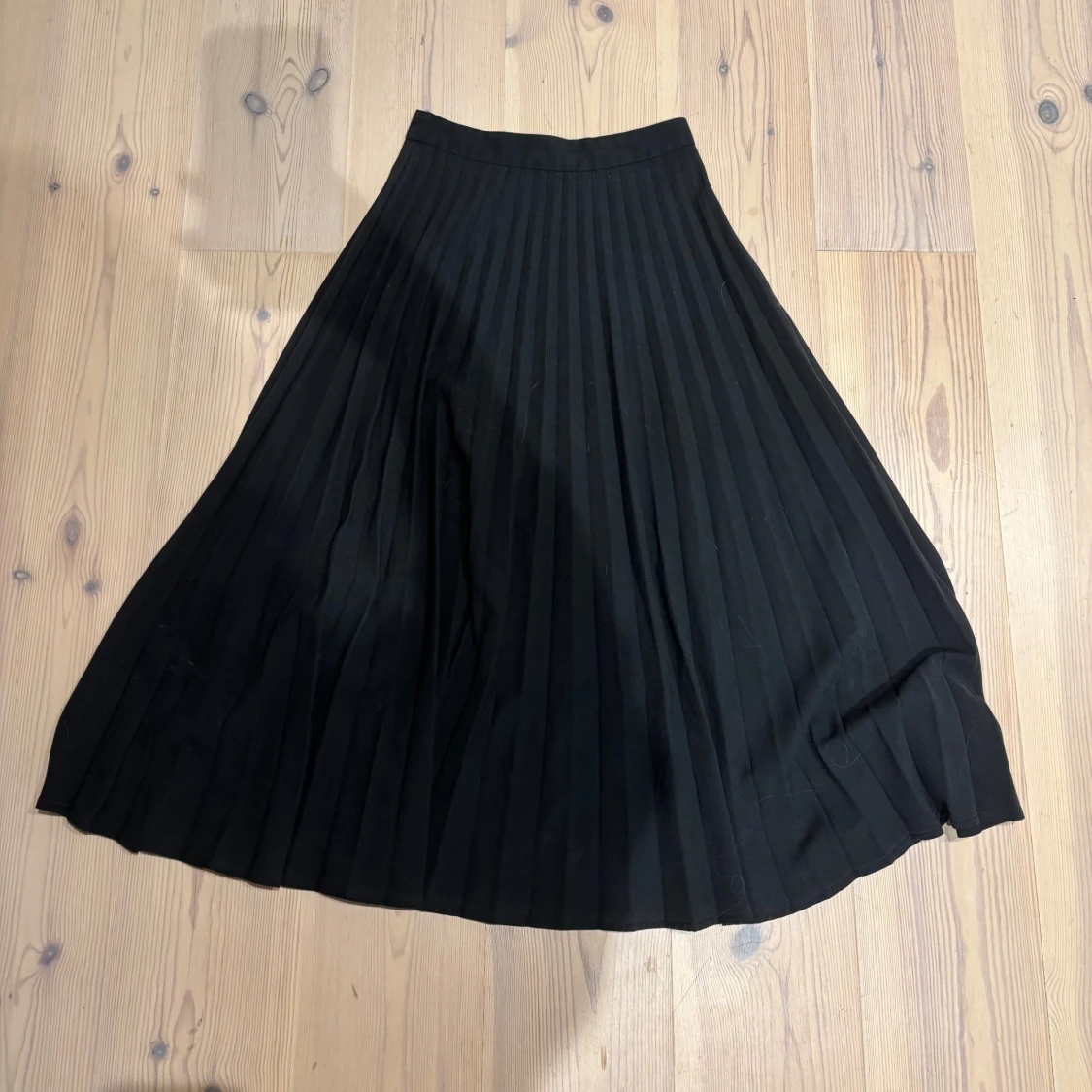 Svart långkjol med snygga plisserade veck som ger ett flowy och elegant intryck. Kjolen har hög midja och klassisk A-linjeform. Perfekt att styla med chunky sneakers eller boots för en cool look. Sömen vid dragkedjan har gått upp lite men syns inte när stängd och är förmodligen lätt att fixa