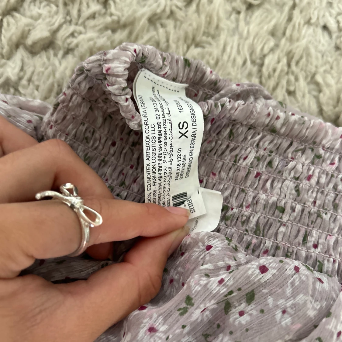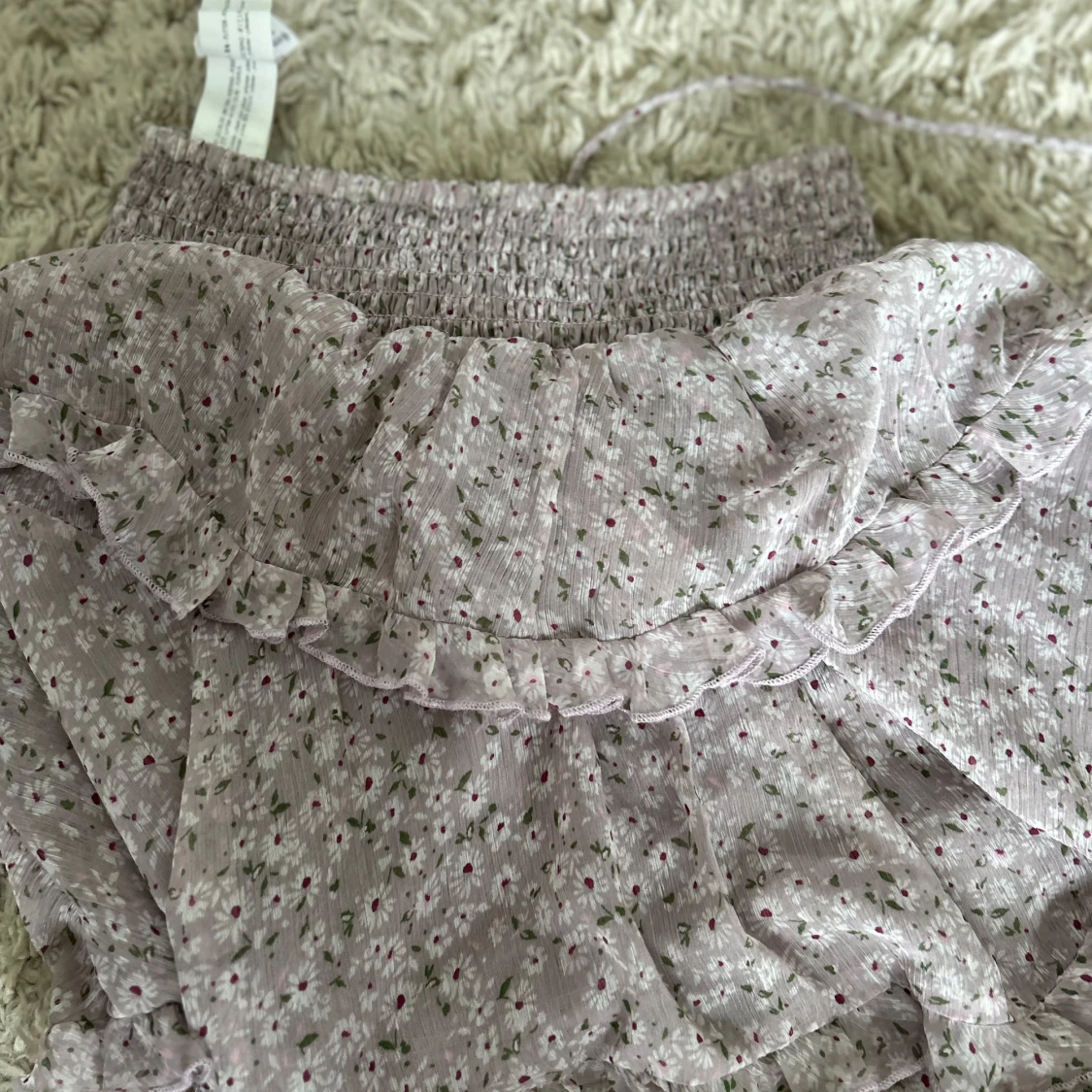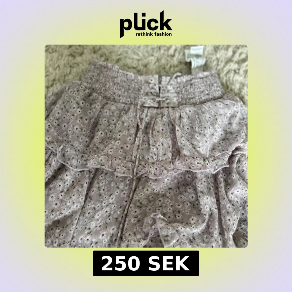 Supersöt kort volangkjol från Stradivarius i ljuslila med små vita och rosa blommor samt gröna blad. Kjolen har smock i midjan och flera lager volanger som ger en flowy känsla. Perfekt för vår och sommar!