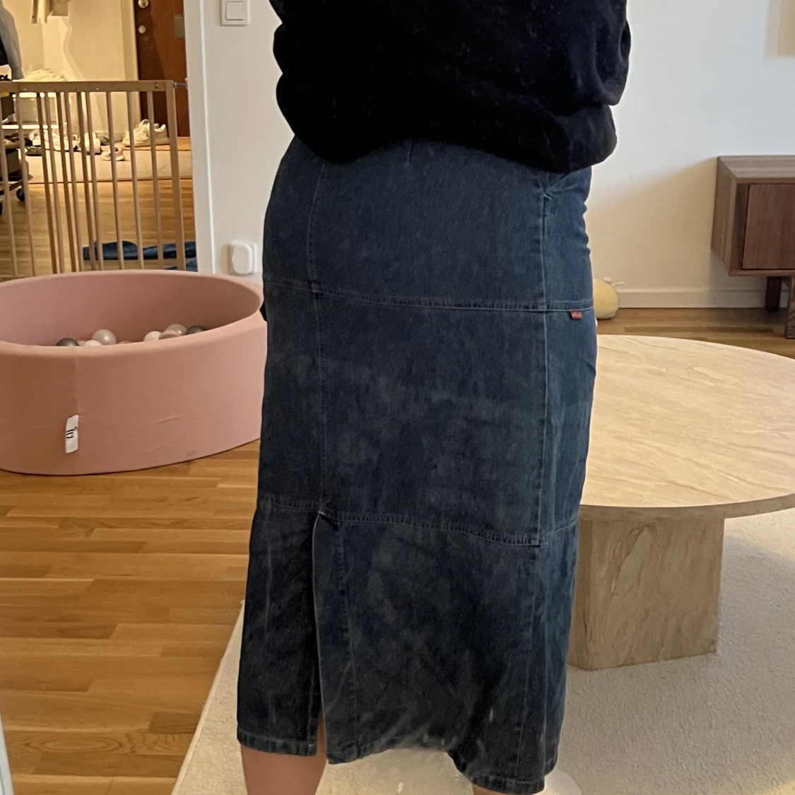 Vintage Maxi denim skirt, has a bleach stain as seen on photo but I still think It looks super cool! Size is unknown but fits like a size 42/44