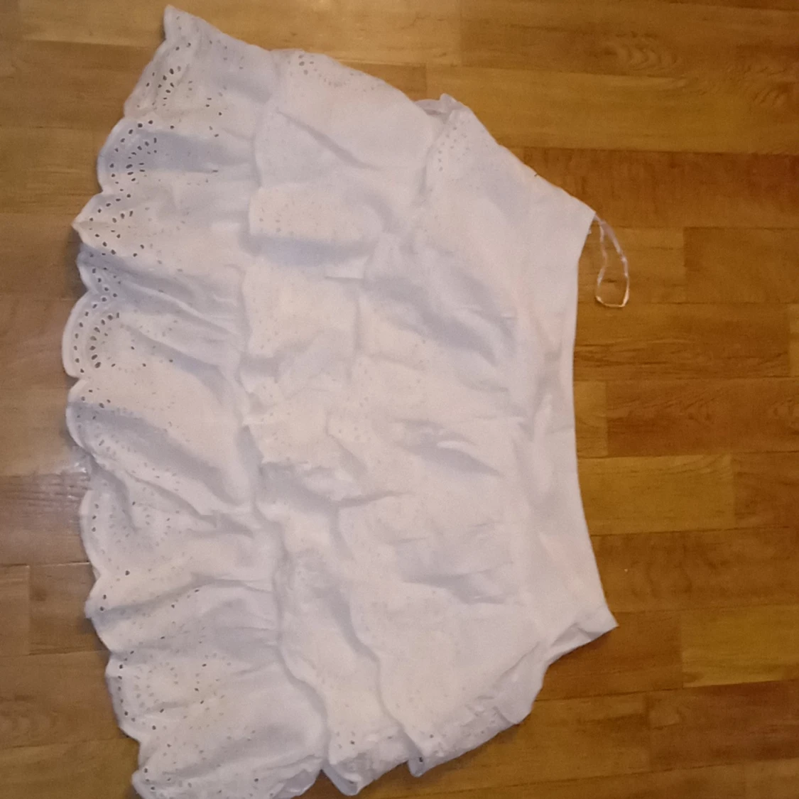 En kort kjol med fina volanger ganska skönt material funkar att ha när man går ut eller på en varm sommardag därimot finns det en liten rosa fläck vid dragkedja men inget man ser på långt håll men går säkert bort i tvätten