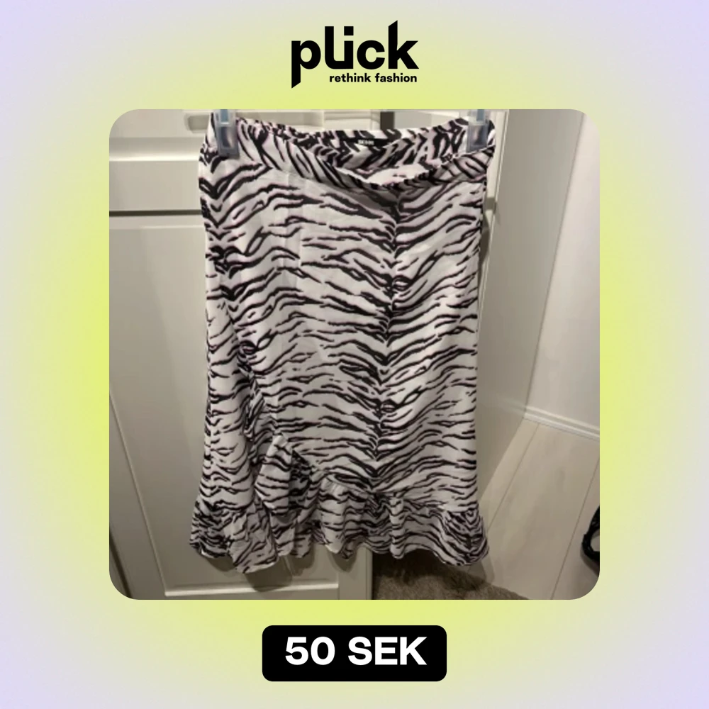En vit och svart zebramönstrad kjol från Bik Bok. Kjolen har en volangdetalj vid nederkanten och är knälång. Den är tillverkad i ett lätt och luftigt material.