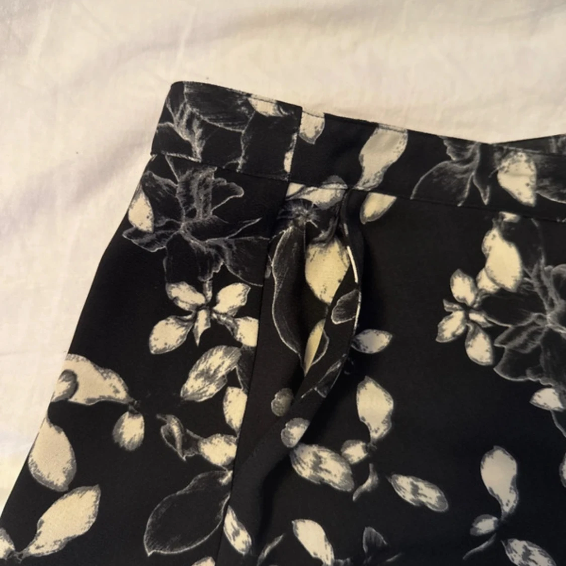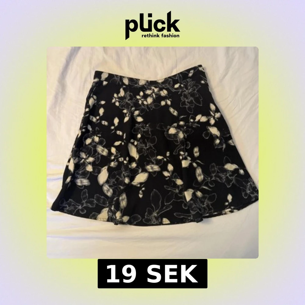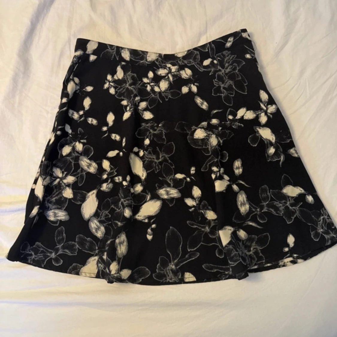 Supersnygg svart kortkjol med vita blommor och knyt i midjan. Kjolen har en lätt utsvängd form som ger en skön och avslappnad vibe. Perfekt för dig som gillar en feminin och trendig look.