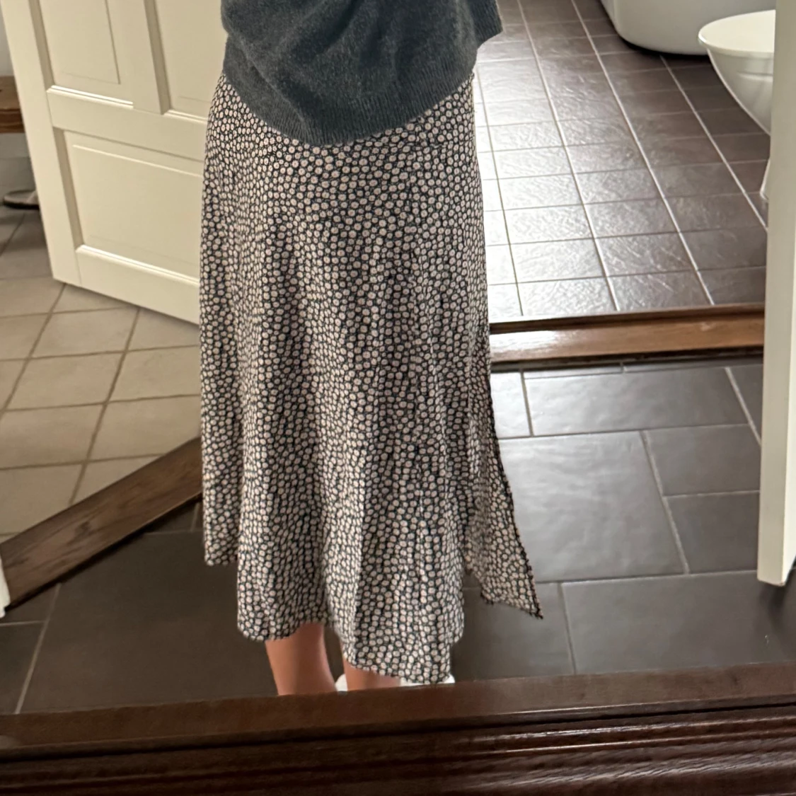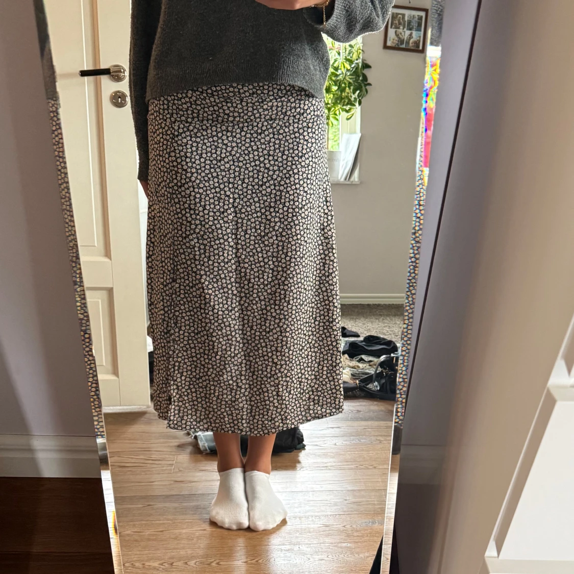 Supersöt svart långkjol med vita och gula blommor. Kjolen har ett mjukt och följsamt tyg som känns skönt mot huden. Perfekt för dig som gillar somriga mönster och vill ha en flowy look.