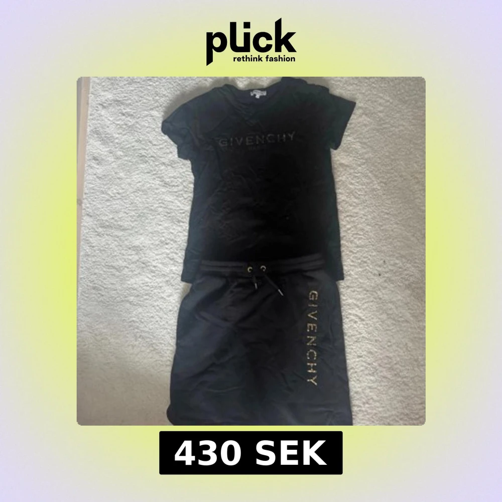Supersnygg svart kortkjol från Givenchy med resår i midjan och snörning. Kjolen har Givenchy-logga i guld längs ena sidan med coola spräckliga detaljer. Tröjan kommer med och matchar snyggt med likadan logga. Perfekt för varje sommardag