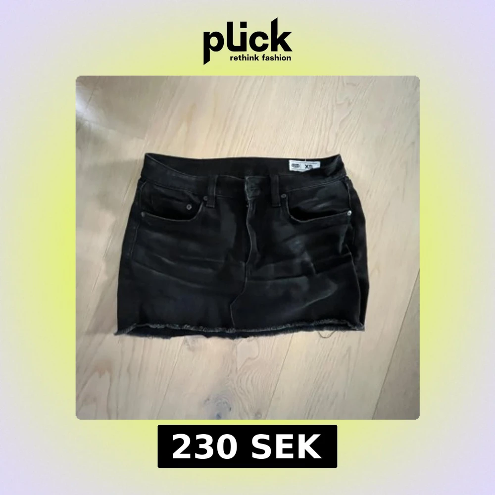 Svart jeanskjol i storlek XS. Klassisk femficksmodell med bälteshällor och rå, fransig kant nedtill för en edgy vibe. Perfekt till sneakers eller boots och funkar året runt. Ljuset är dåligt, den är inte så vit.