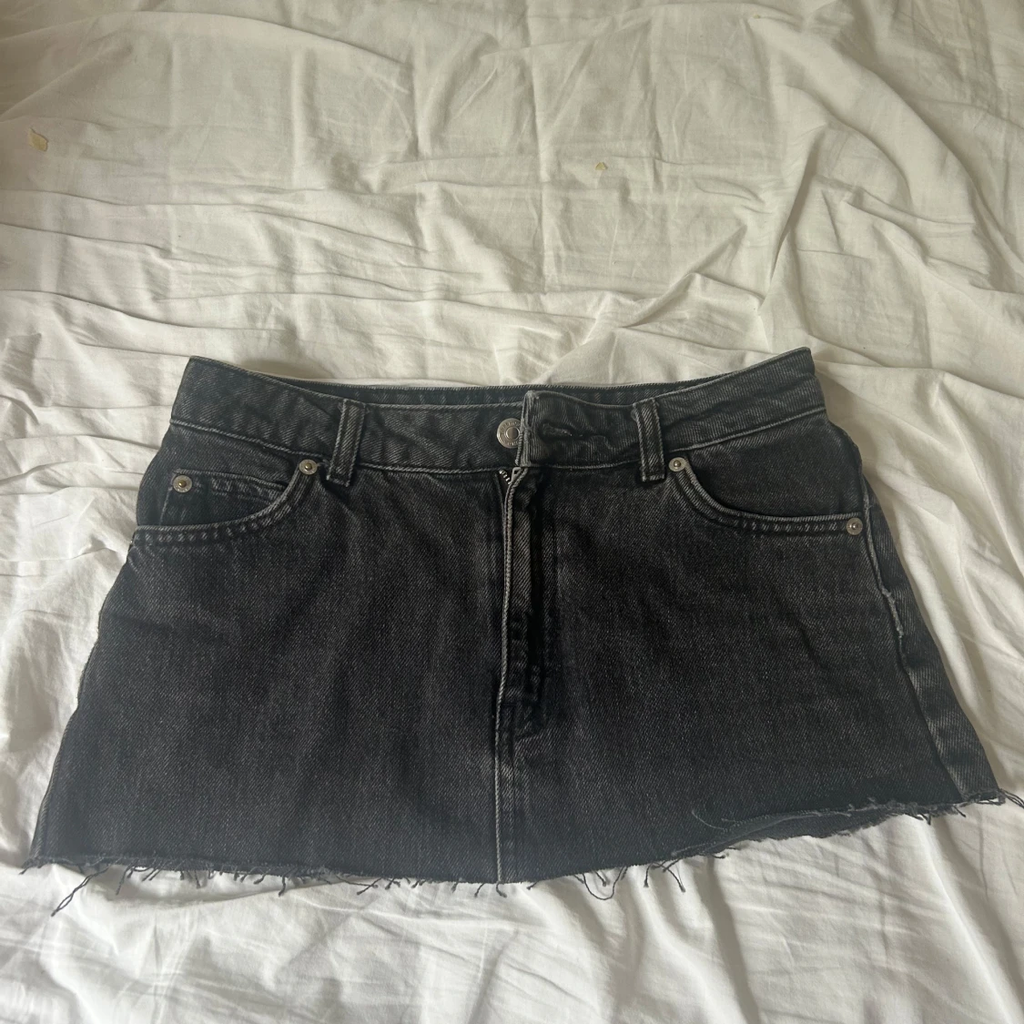 Säljer en svart jeanskjol i kort modell med rå, fransig kant nertill. Kjolen har klassiska fem fickor, bälteshällor och dragkedja med knapp framtill. Perfekt för dig som gillar en edgy och avslappnad stil. Midjemåttet är 35cm och längden 25cm💞