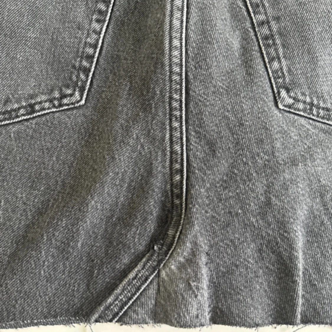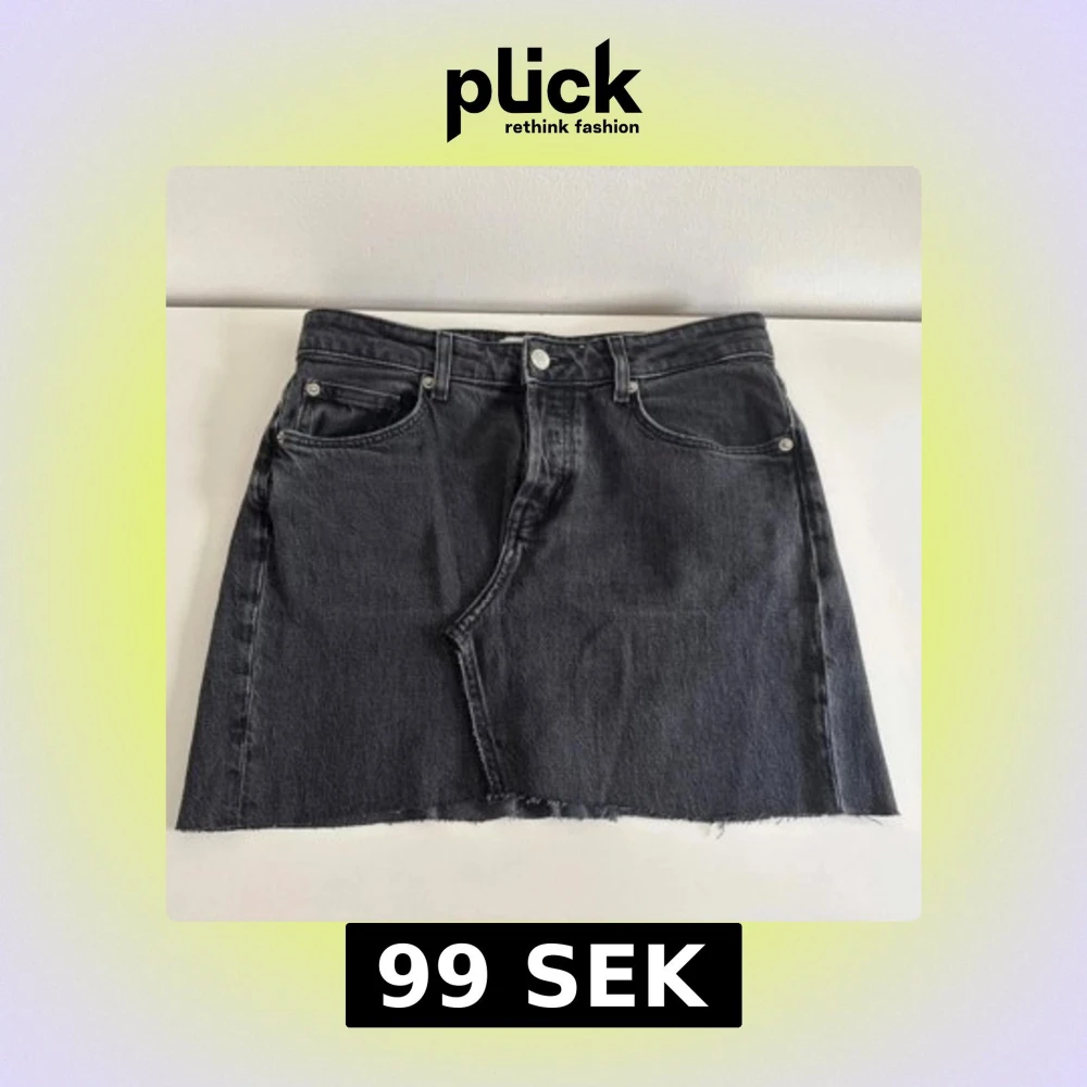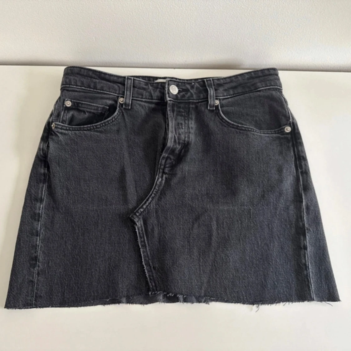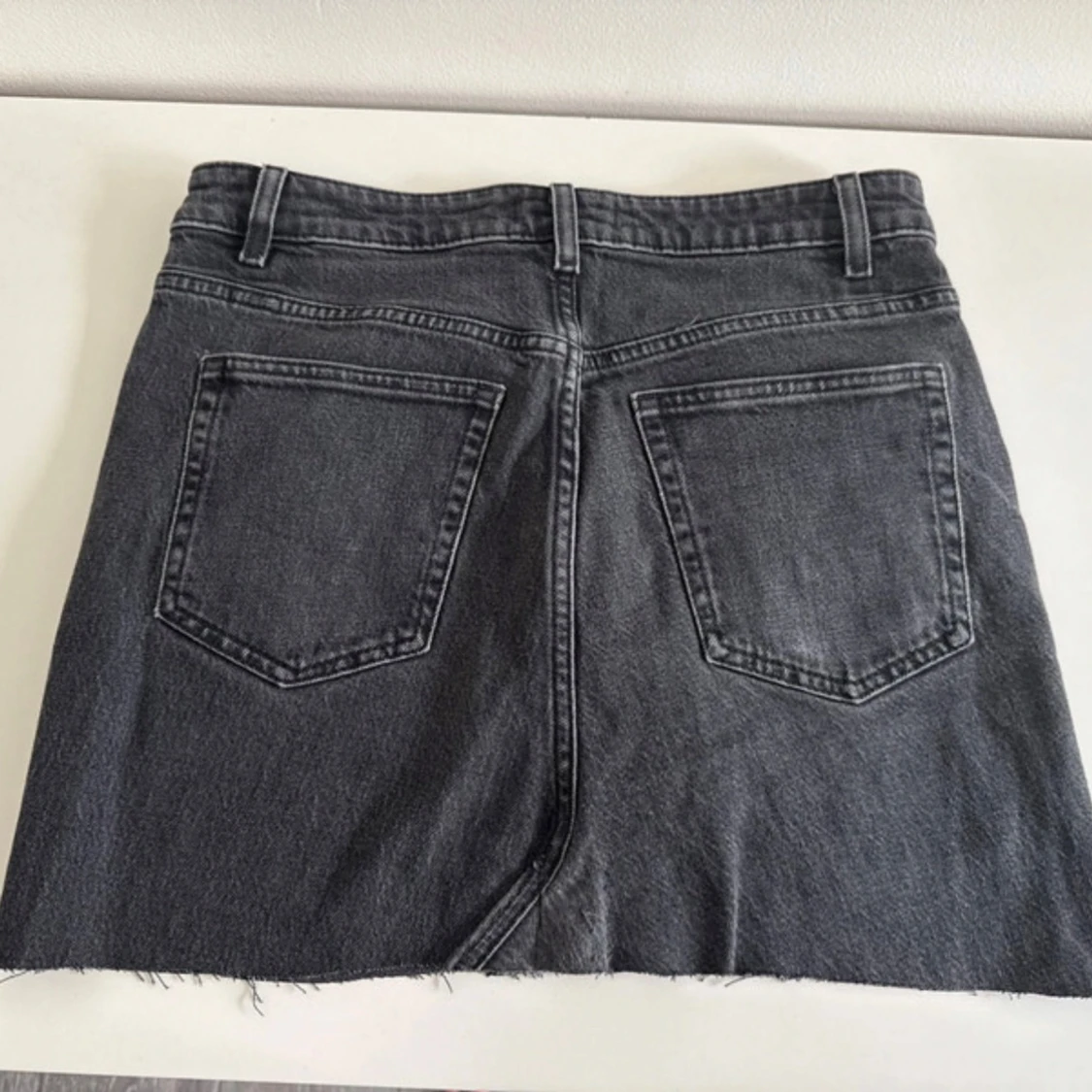 Säljer en svart jeanskjol med rå och fransig kant nertill, sol jag har sytt om från ett par jeans. Kjolen har en rak passform och synliga sömmar framtill och baktill för en cool, avslappnad look. Storleken är 40, men de är väldigt små, skulle säga S