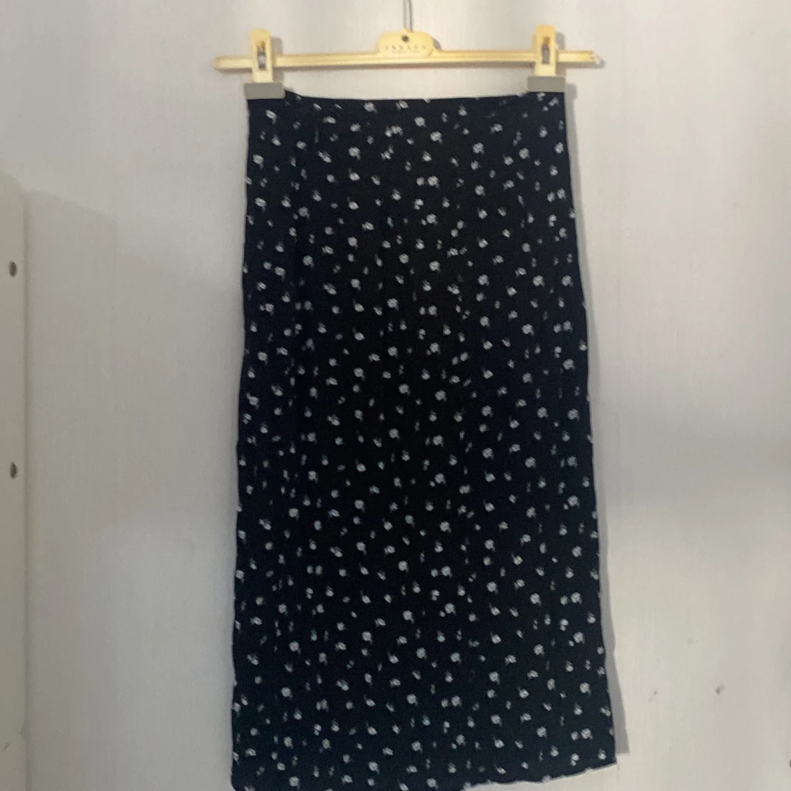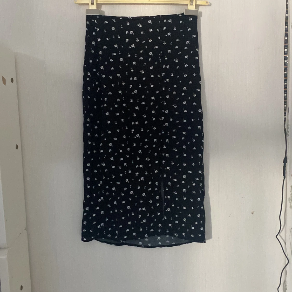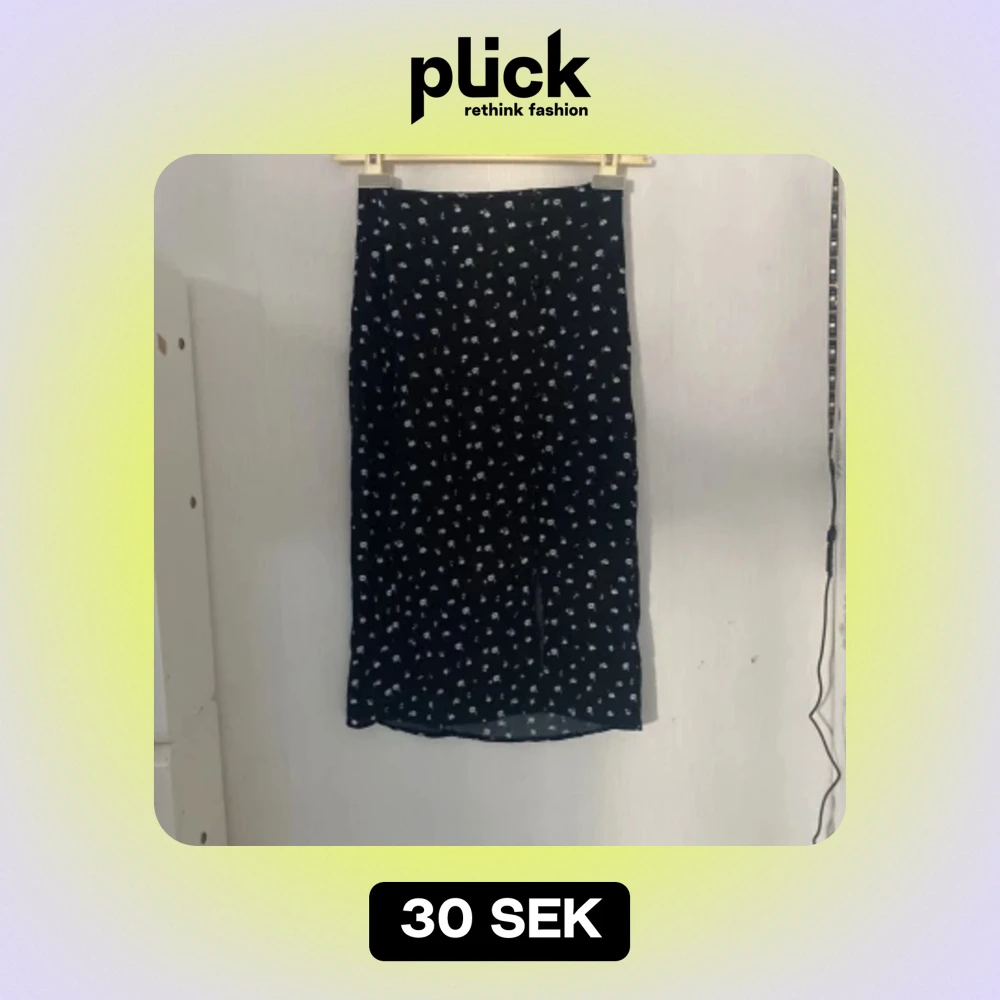 Kjolen är använd några gånger men känns ny. Den har slits vid ett ben med knappar upp (se bilden)