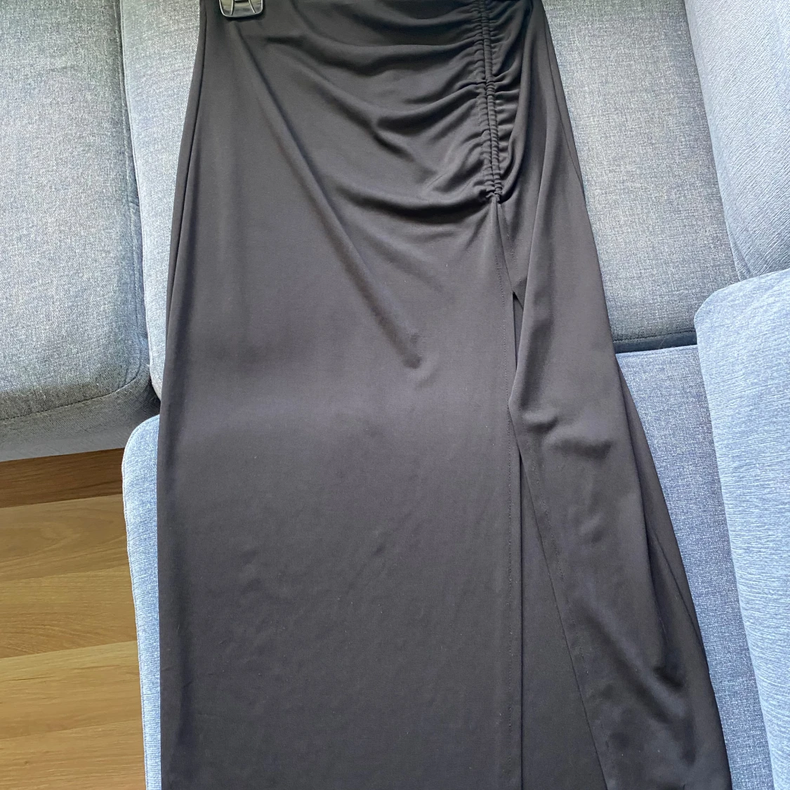 Svart medellång kjol, går till typ mitten av smalbenen. Har en slit på vänstra sidan och typ scrunch ovanför, superfin. Köpt på Gina Tricot för två år sen för skolavslutning men knappt använd efter det.