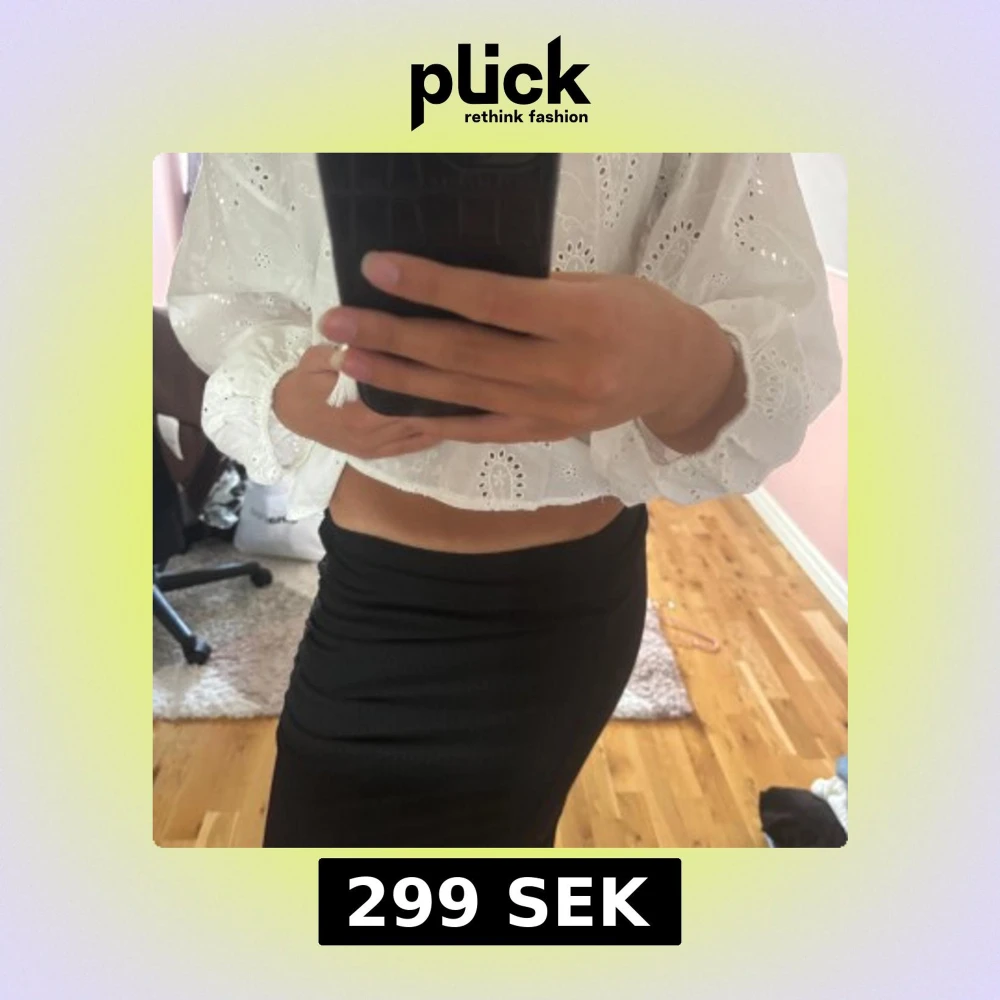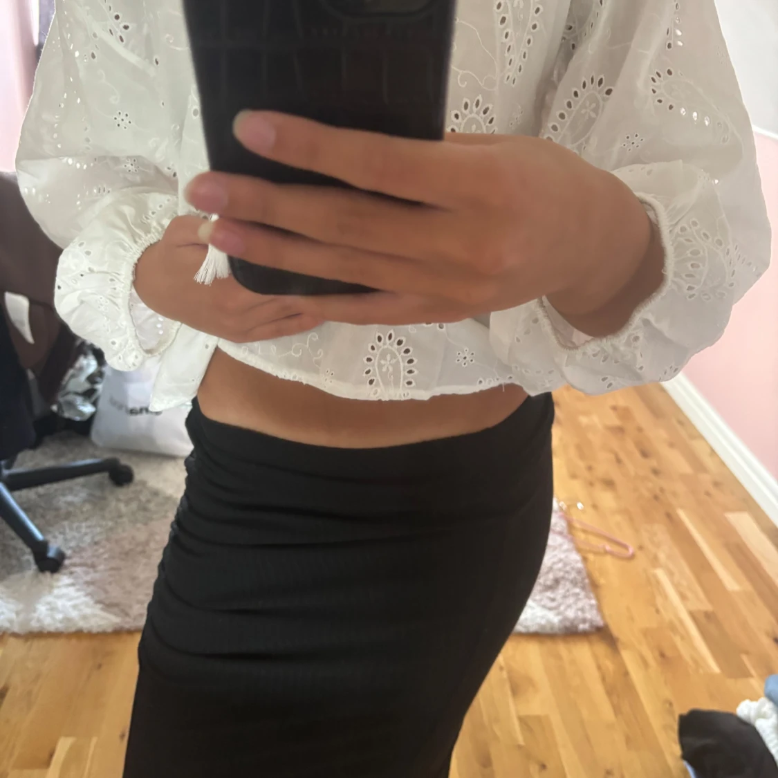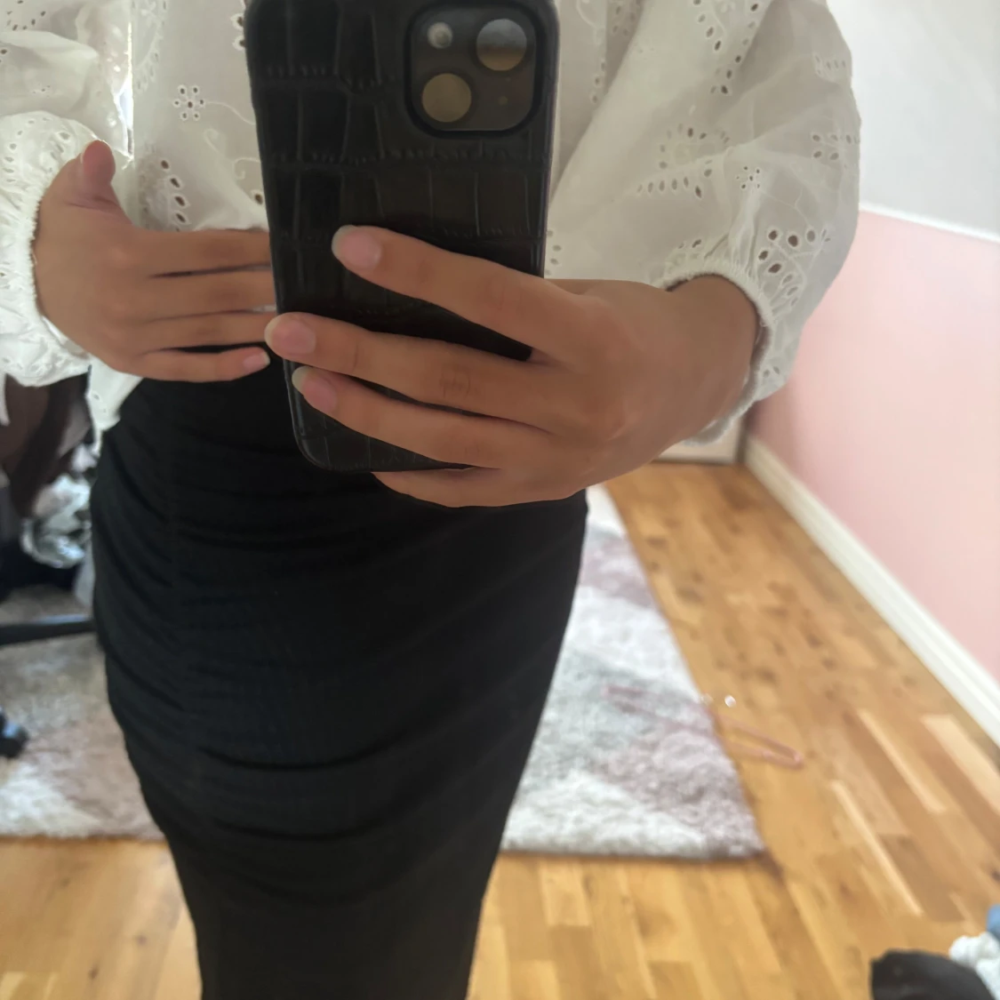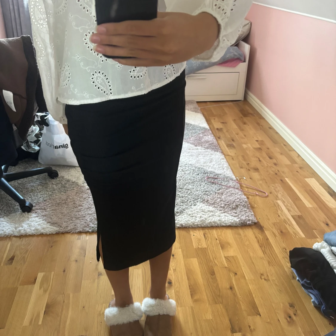 Säljer en svart lång-midi kjol med tight passform och liten slits på sidan. Kjolen har en ”scrunch” detalj på sidan, perfekt om du gillar minimalistisk stil. Materialet känns mjukt och stretchigt, vilket gör den bekväm att bära hela dagen. Använd 2 ggr