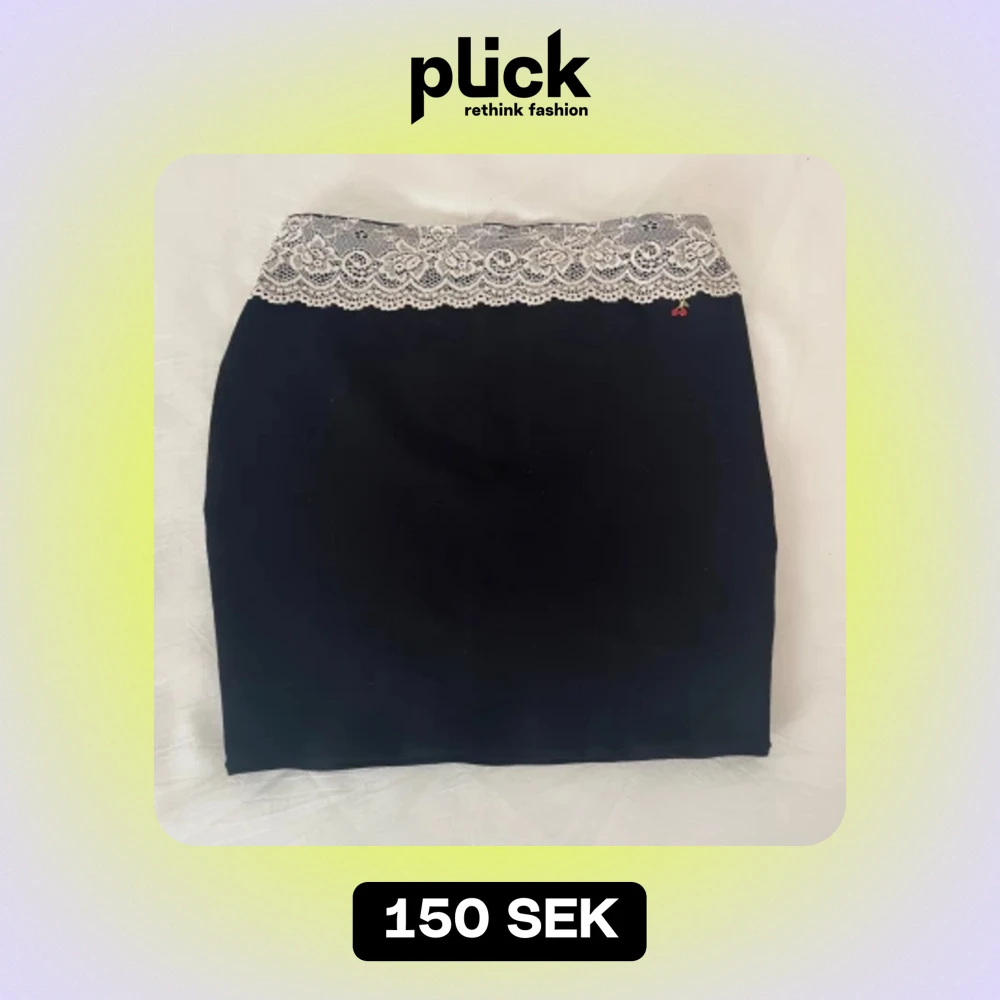 Svart kjol med stretch och resår i midjan, dekorerad med stretchig spets och en körsbärs-charm. Storleken funkar till både S och M💗