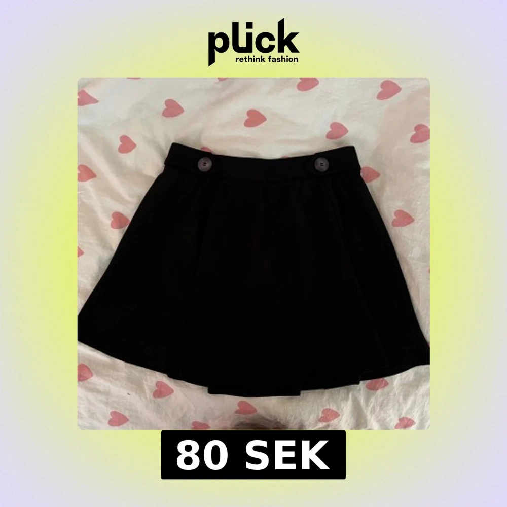 Supersöt svart kortkjol från Terranova i strl M med två stora knappar framtill i midjan. Kjolen har en lätt utställd form som ger en snygg siluett!💞