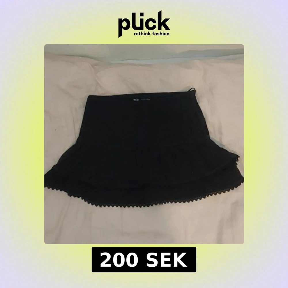 Snygg svart kortkjol från Zara med volangdetaljer. Perfekt för att skapa en stilren look. Kjolen har en enkel design som gör den lätt att matcha med olika toppar.