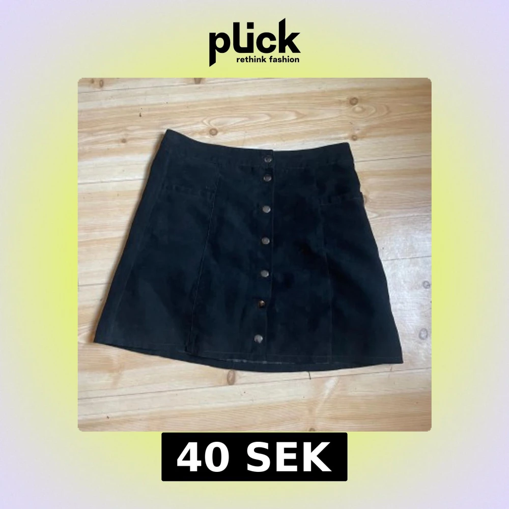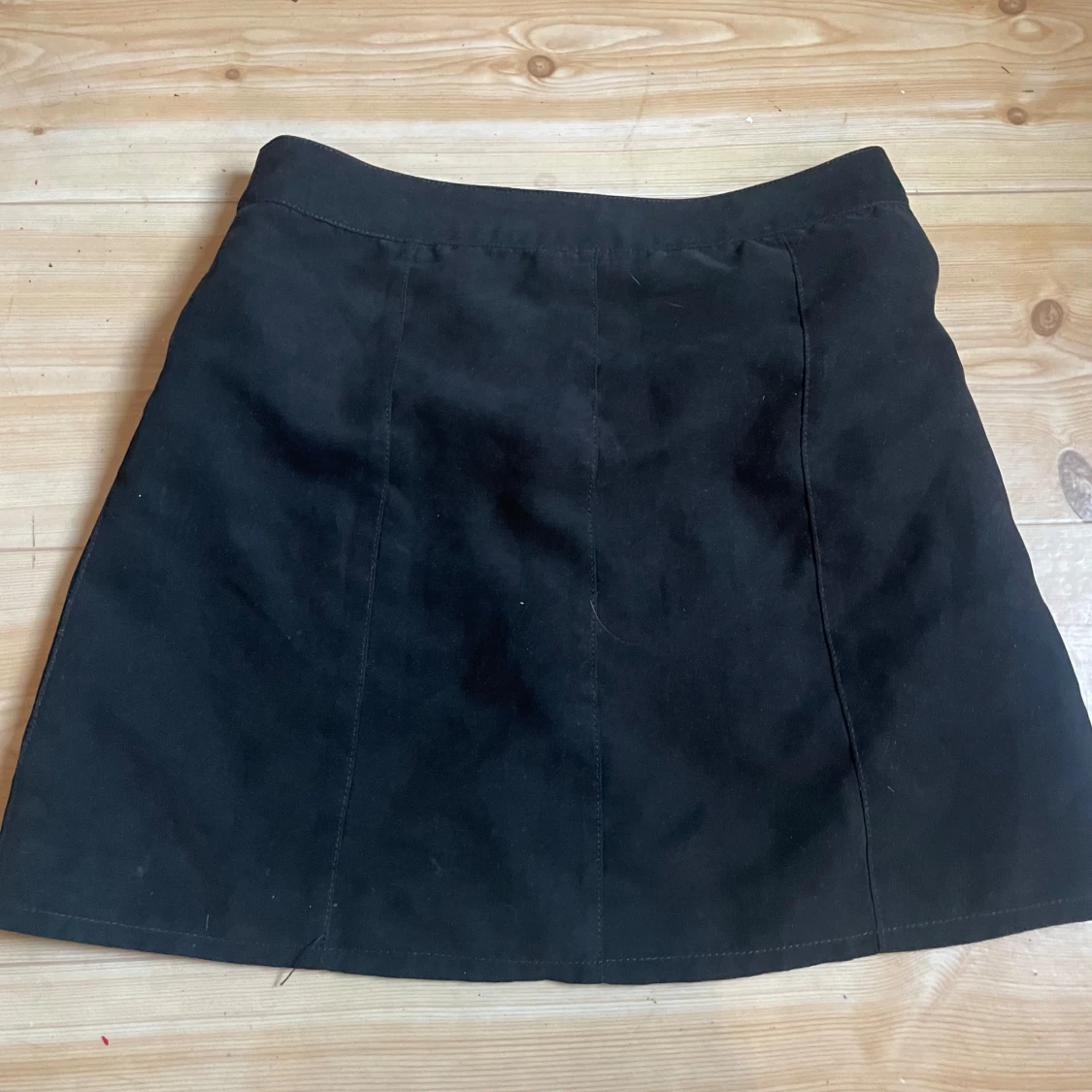 Svart A-linjeformad kortkjol från Divided med snygga silverfärgade knappar framtill. Kjolen är gjord i mjuk mockaimitation och har två fickor fram. Perfekt för dig som gillar en stilren och trendig look.