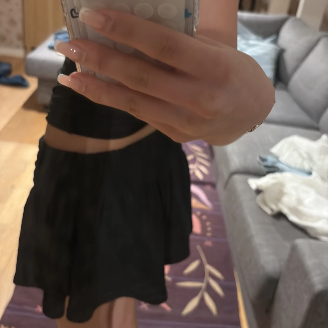 Snygg svart kortkjol med en lös passform. Perfekt för en stilren look. Kjolen har en enkel design utan mönster eller detaljer, vilket gör den lätt att matcha med olika toppar.