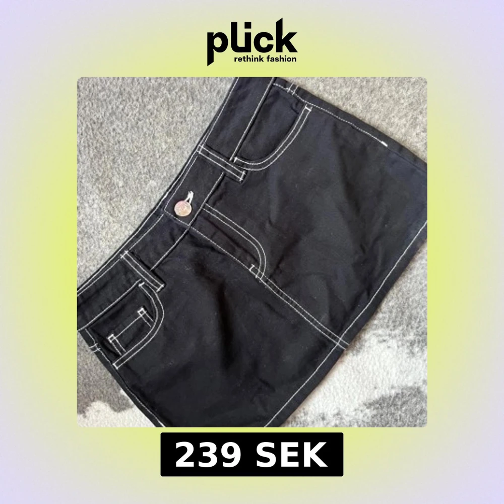 Snygg svart mini kjol med vita kontrastsömmar och praktiska fickor fram och bak. Kjolen har en knappdetalj i silver och en klassisk jeansstil. Perfekt för en trendig look.