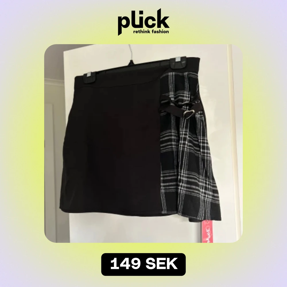 Säljer en superfin svart kortkjol med en cool rutig detalj på sidan. Kjolen har en litet spänne som ger den en extra touch. Perfekt för både vardag och fest! 🖤