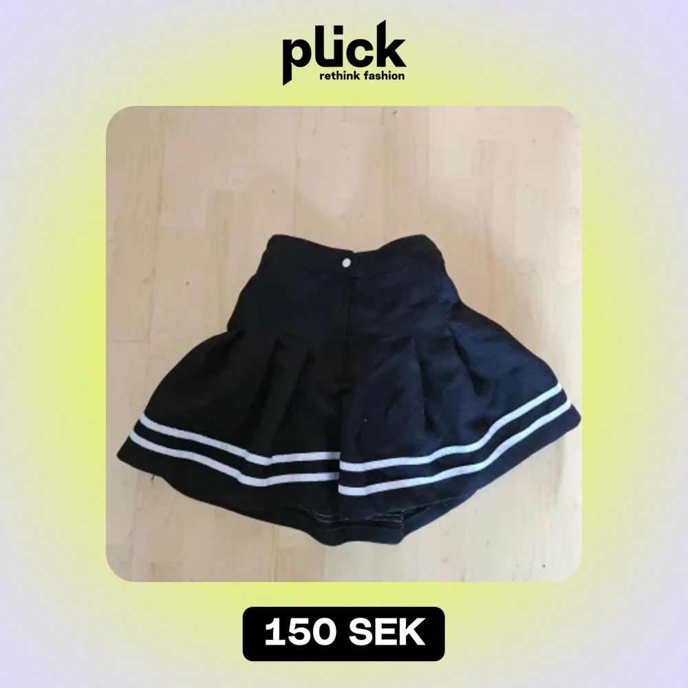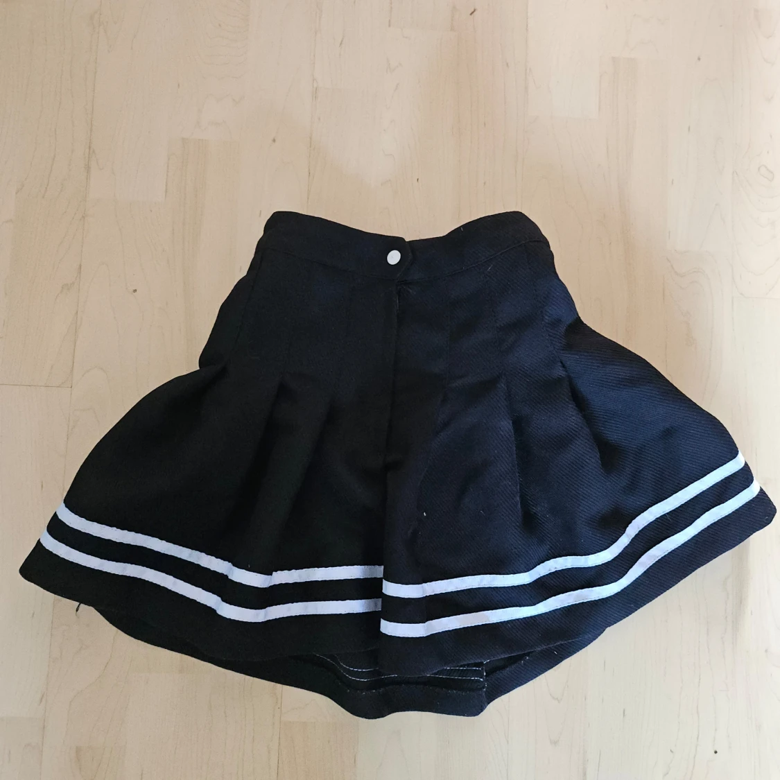 Säljer en superfin svart kortkjol med två vita ränder längst ner. Kjolen har en knapp och dragkedja framtill för enkel på- och avtagning. Perfekt för både vardag och fest! 🖤