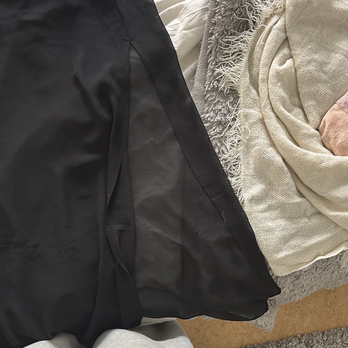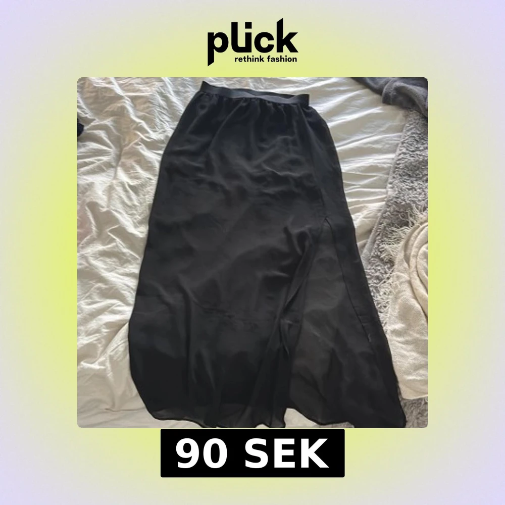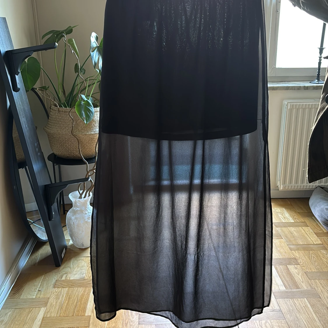 Svart långkjol från H&M Divided med elastisk midja och transparent nederdel. Kjolen har en slits på sidan och är tillverkad i lätt och luftig polyester, perfekt för en trendig look.
