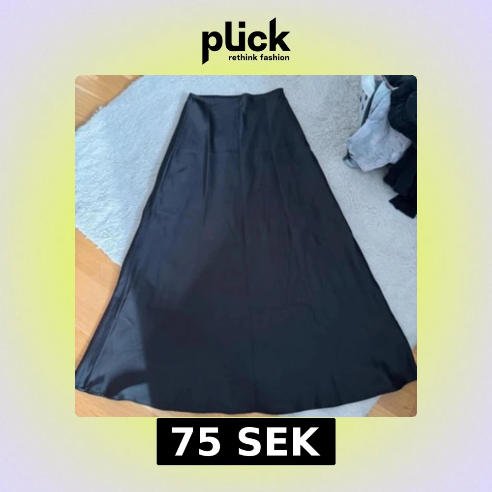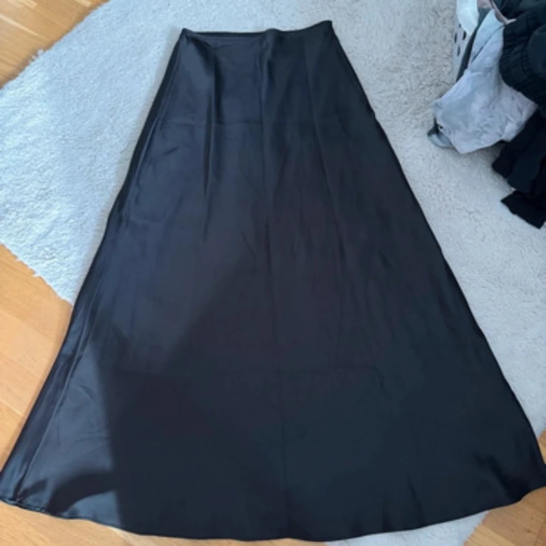 Säljer en svart långkjol med snyggt fall och lätt glansig yta. Kjolen har en enkel och stilren design som ger en elegant vibe. Perfekt att matcha med en crop top eller stickad tröja för en cool look.