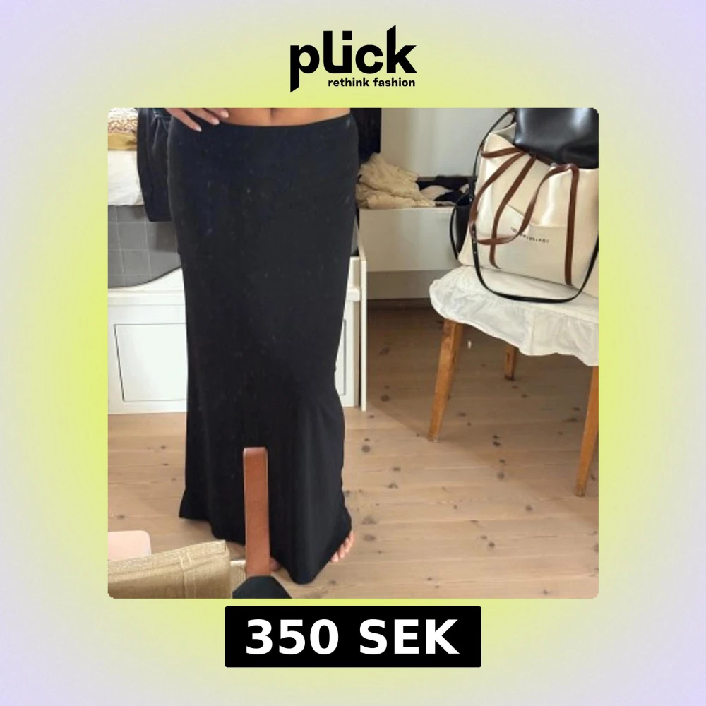 En svart långkjol med rak passform och enkel design. Kjolen är gjord i ett stretchigt material som sitter snyggt och bekvämt på kroppen. Perfekt att styla med crop tops eller oversized tröjor för en clean look. Aldrig använd