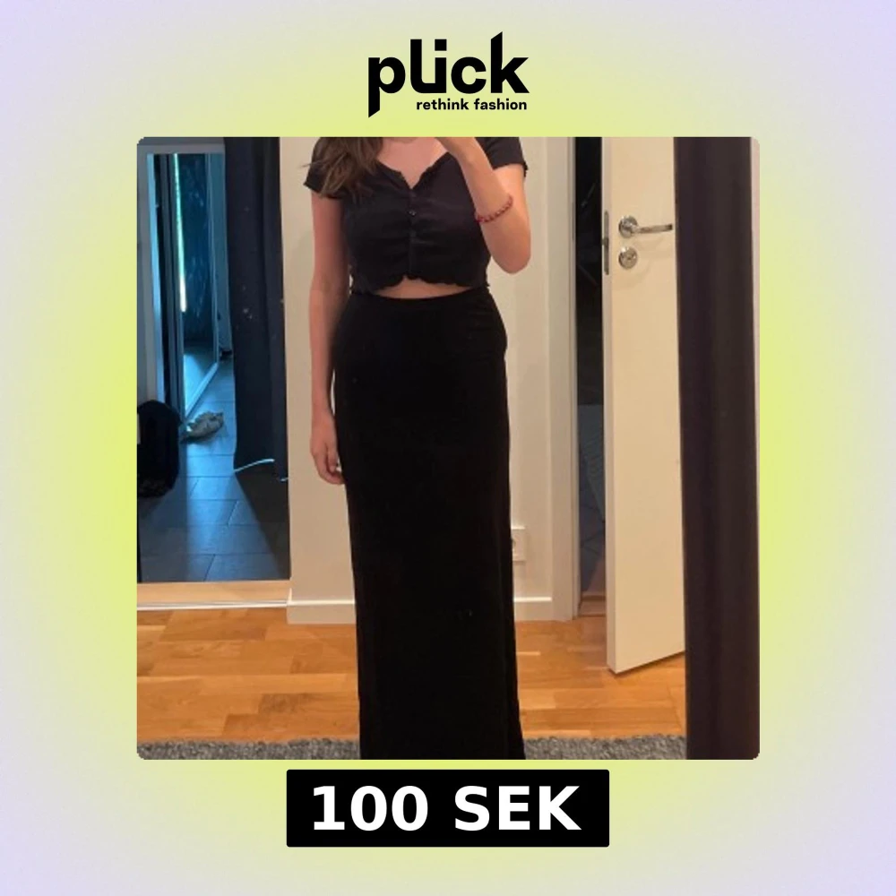Säljer en svart långkjol med hög midja och figurnära passform. Kjolen är enkel och stilren utan mönster eller detaljer, perfekt om du gillar minimalistisk stil. Materialet känns stretchigt och följsamt, vilket gör den bekväm att bära hela dagen.