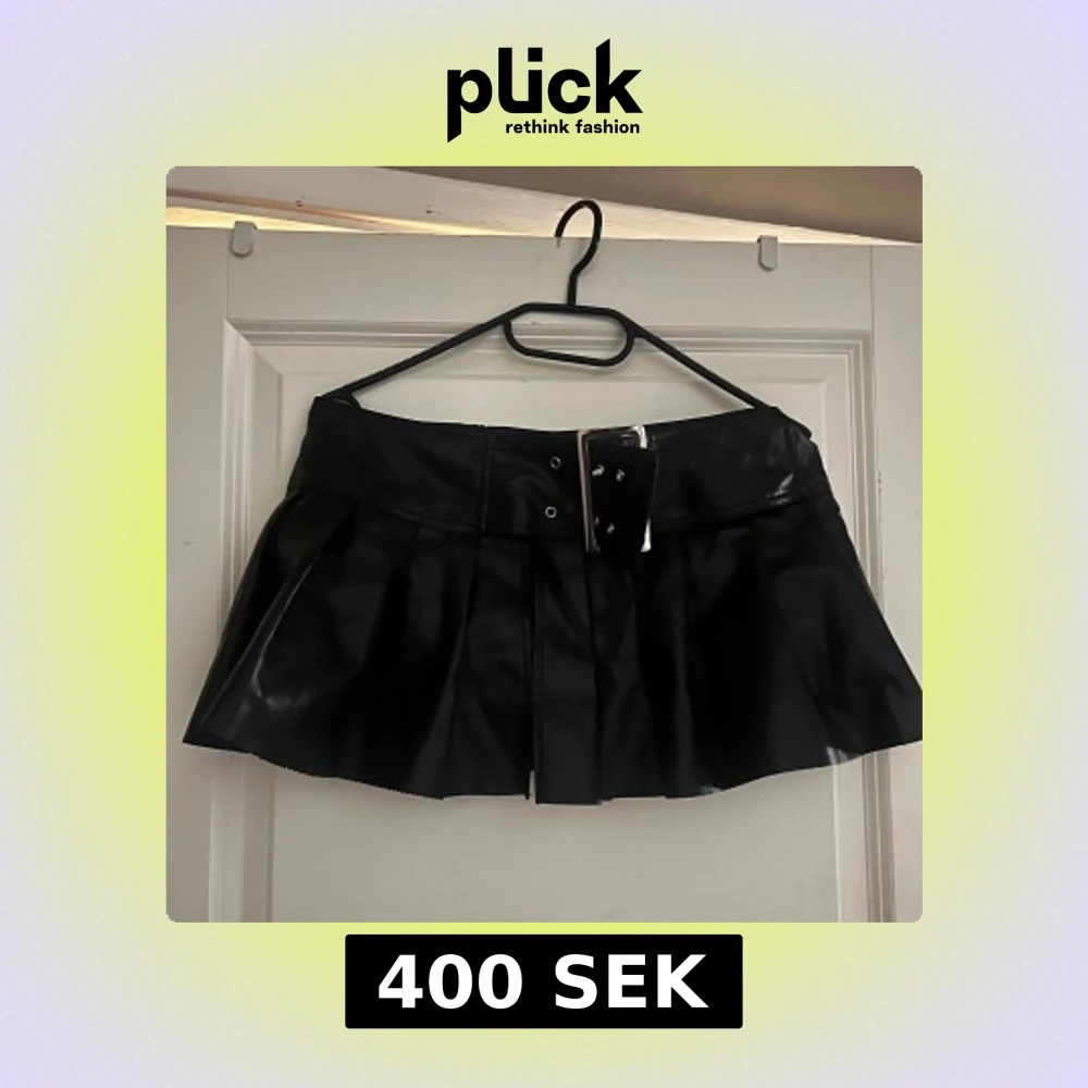Snygg svart kortkjol i skinnimitation med bredt bälte och silverspänne. Pris kan diskuteras 🥰