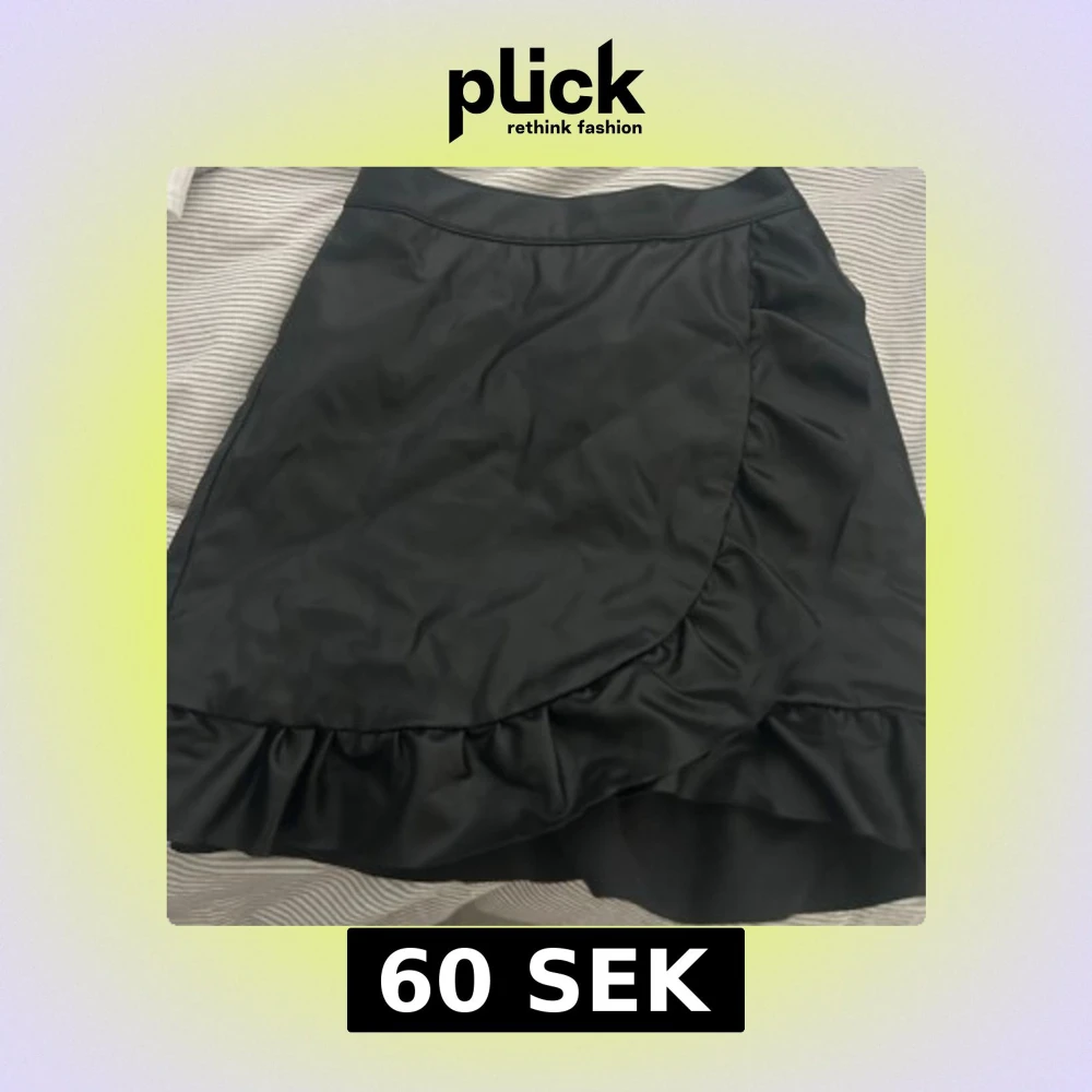 Snygg svart omlottkjol med volangkant nertill. Kjolen har en stilren design och passar perfekt till mĂ„nga olika outfits. Den har dessutom ett skinnmaterial. đ