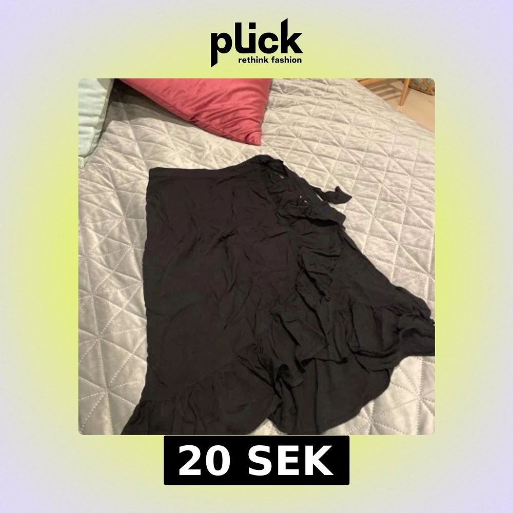 Svart kort omlottkjol från Lindex med snygga volangdetaljer längs kanten och knyt i midjan. Kjolen är i mjuk bomull och har en lätt och luftig känsla, perfekt för en trendig och avslappnad look.