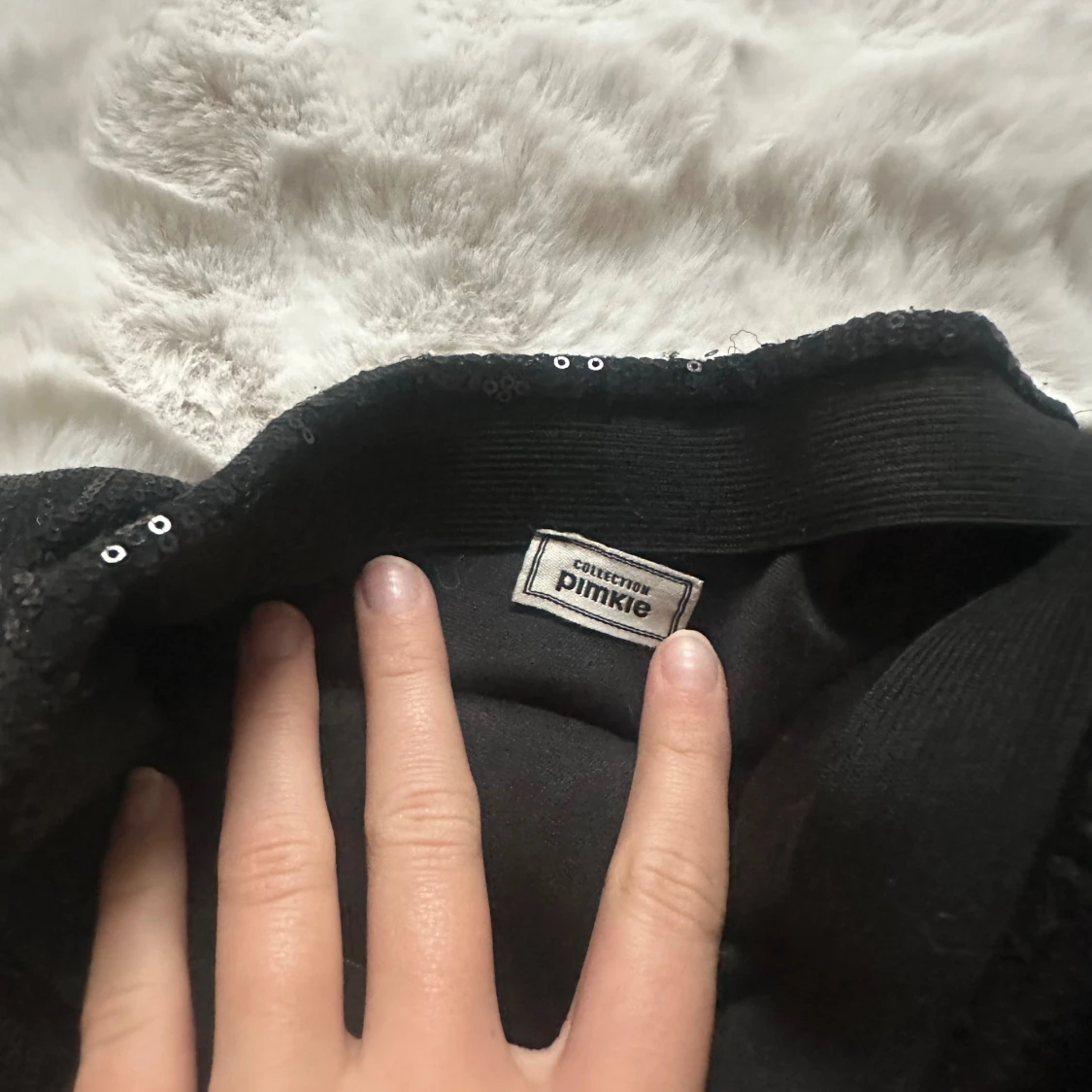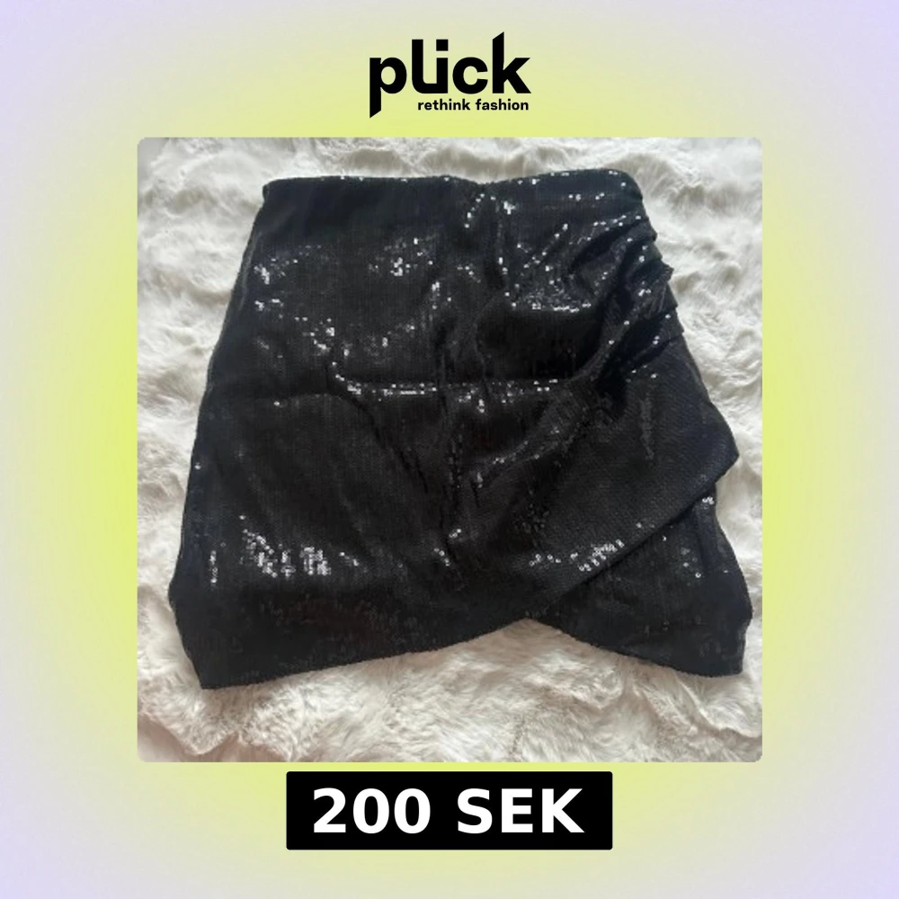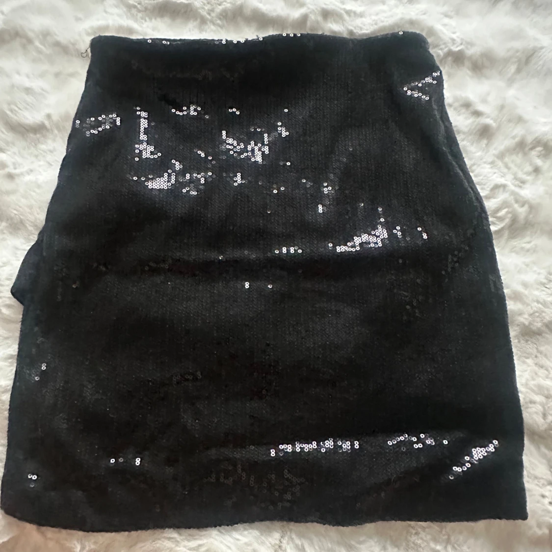 Snygg svart kortkjol från Pimkie med glittriga paljetter över hela ytan. Kjolen har omlott-design framtill och är perfekt för dig som vill sticka ut med lite extra bling. Materialet är mjukt och följsamt, vilket gör den bekväm att bära.