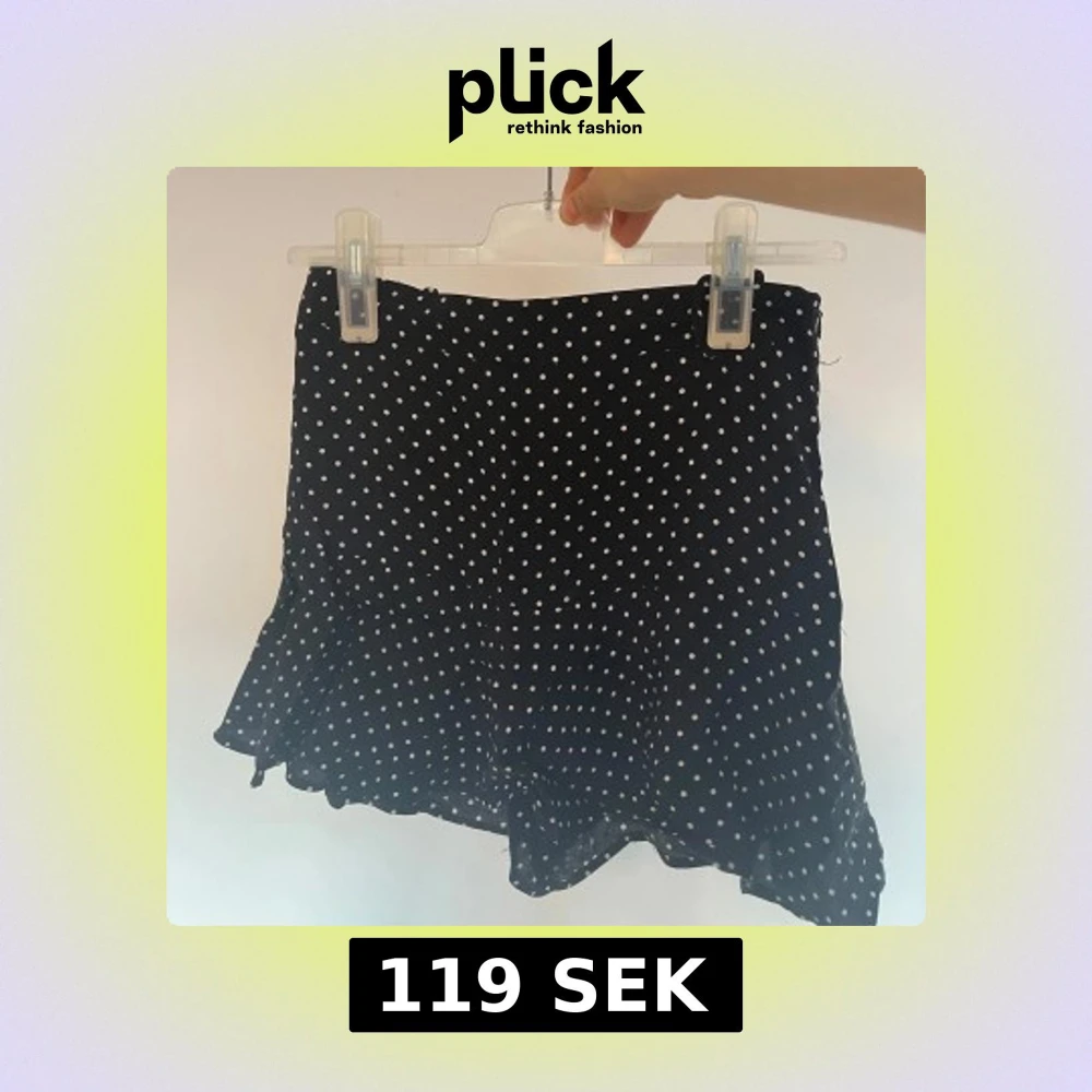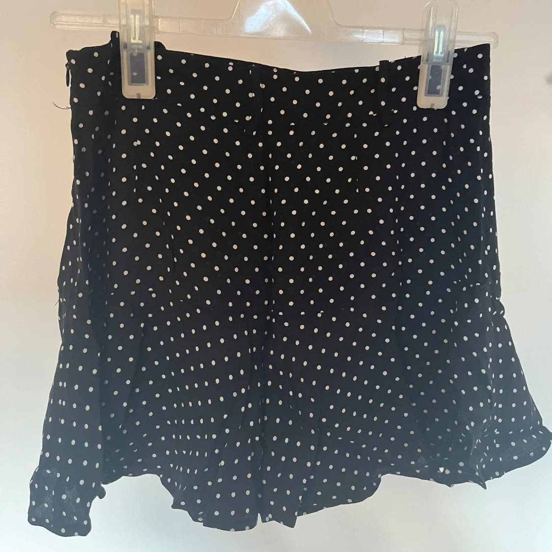Supersöt svart kortkjol med vita prickar och volangkant. Kjolen har en lätt och flowy känsla, perfekt för att skapa en lekfull look. Stängs med dragkedja i sidan och har en feminin passform som sitter snyggt i midjan.💞💞