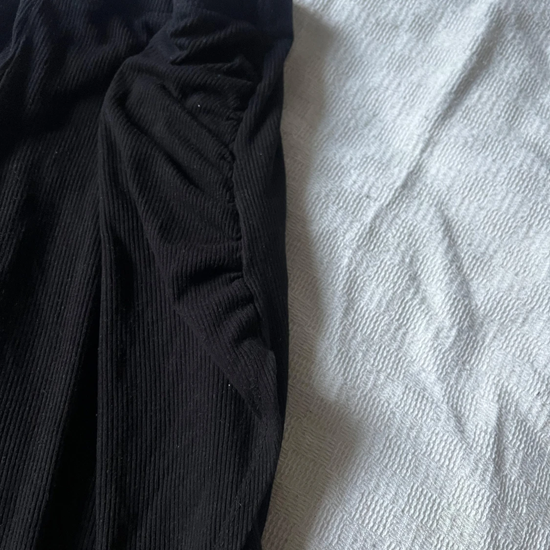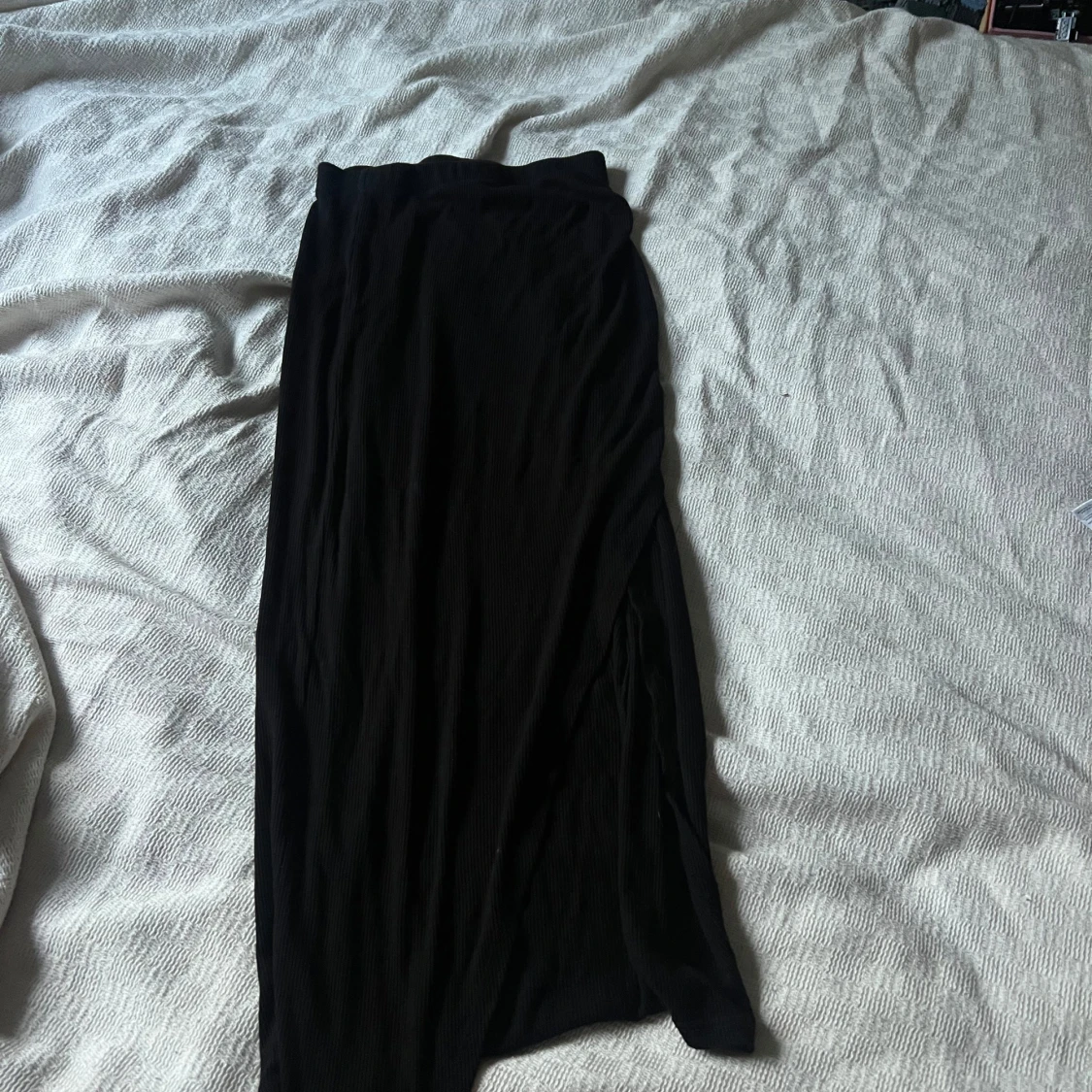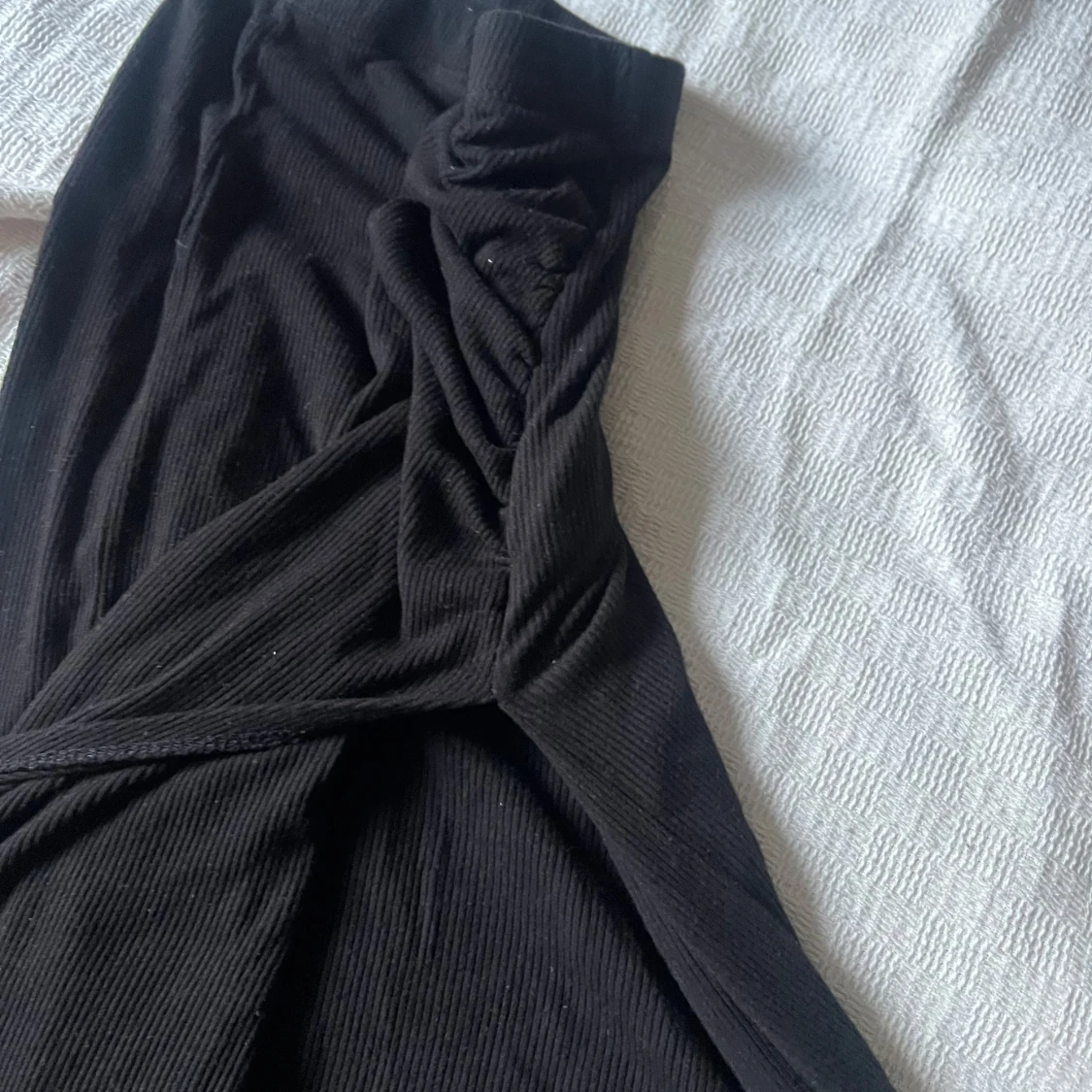 Säljer en svart långkjol i ribbat tyg med snygg drapering på sidan. Kjolen har en tight passform och är perfekt om du gillar en stilren och enkel look. Materialet är stretchigt och följsamt, vilket gör den superbekväm att bära. Det är en hög slits som framhäver benen ❤️