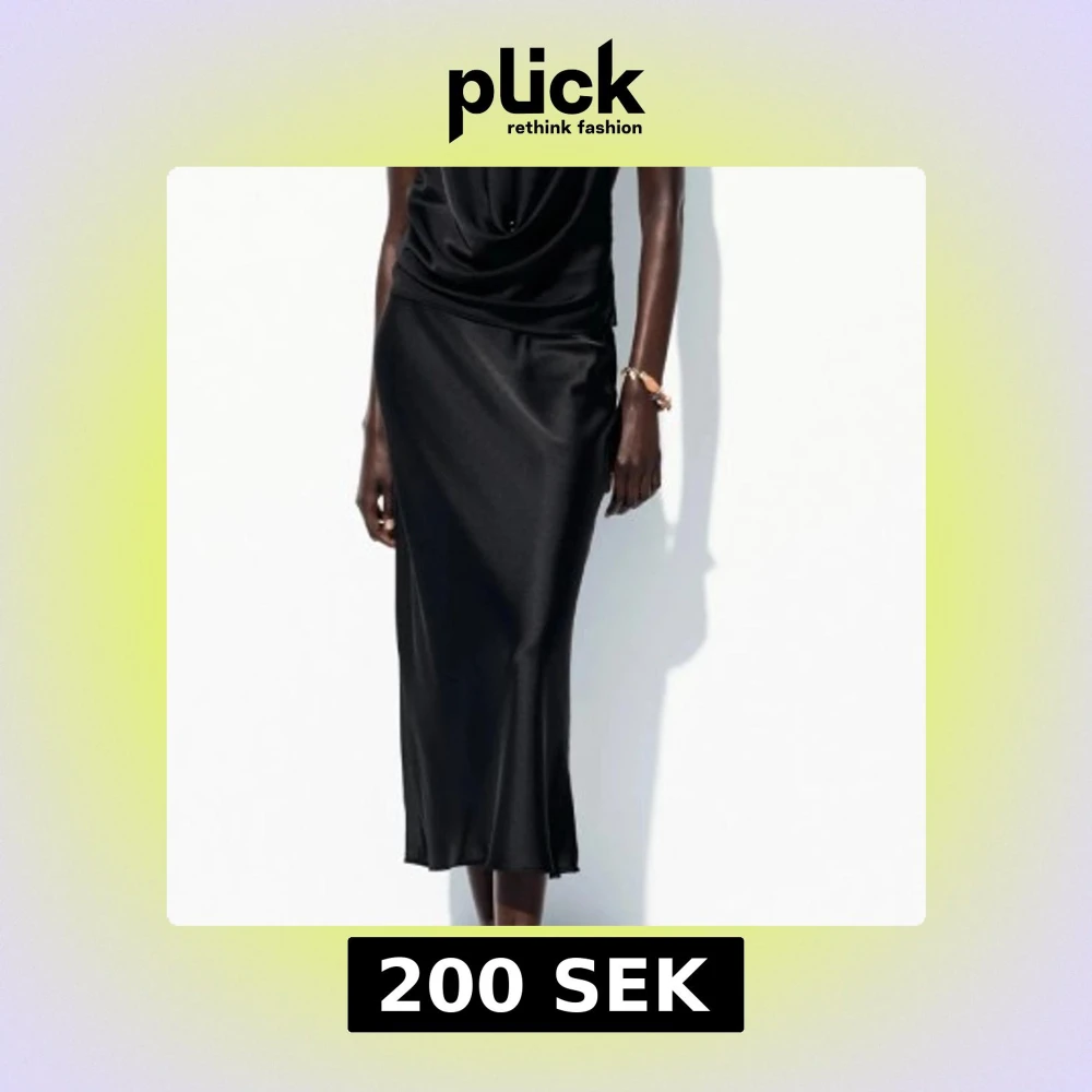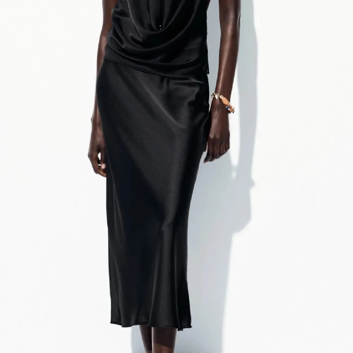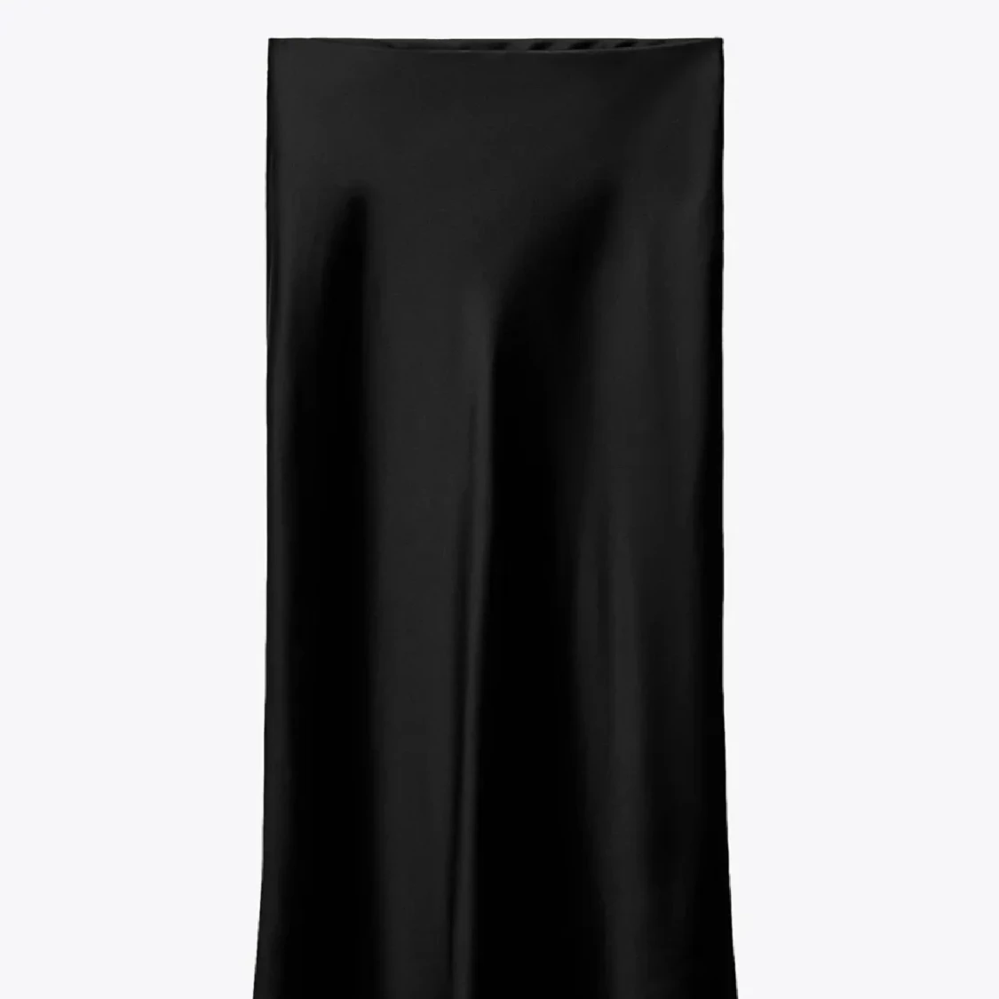 Säljer en svart långkjol i glansig satin med stilren och enkel design. Kjolen har en rak passform som faller snyggt längs kroppen och ger en elegant look. Perfekt att styla med både sneakers och klackar för en trendig vibe. Från zara