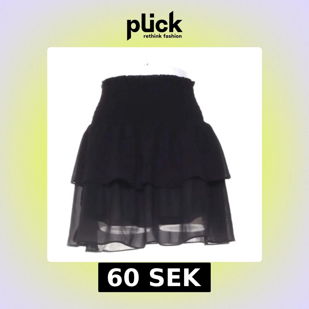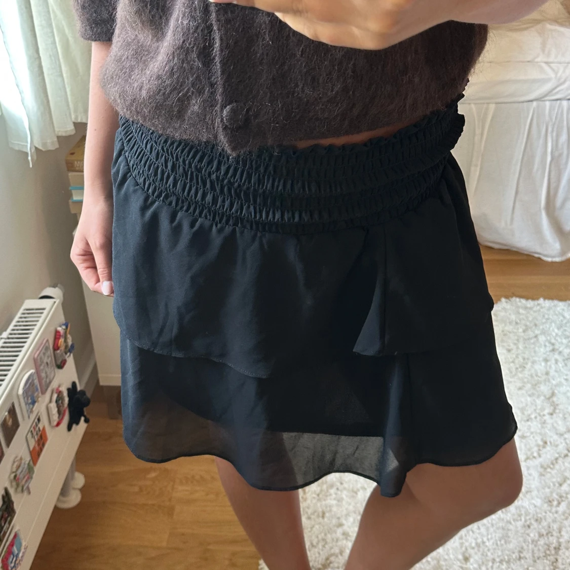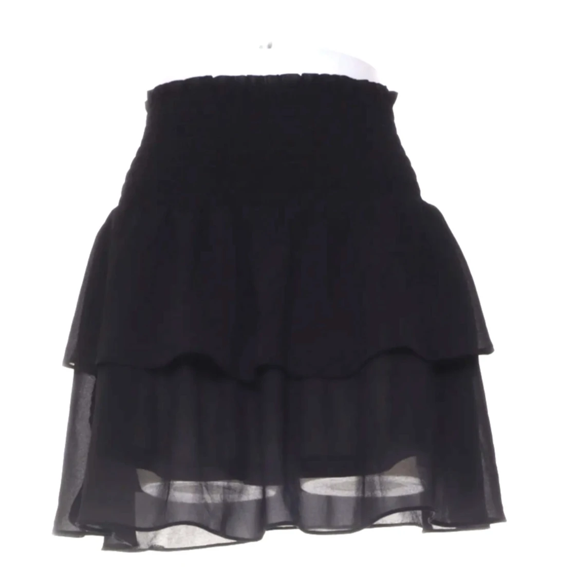 Säljer en svart kortkjol med bred smockad resår i midjan och dubbla volanger. Kjolen är gjord i ett tunt, lätt och transparent tyg som ger en luftig känsla. Perfekt för dig som gillar en feminin och trendig stil.